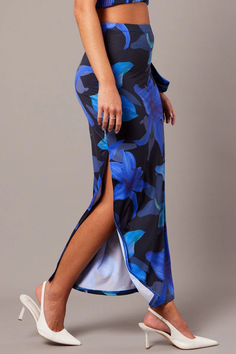 Blue Floral Maxi Skirt Tube Side Split Skirt