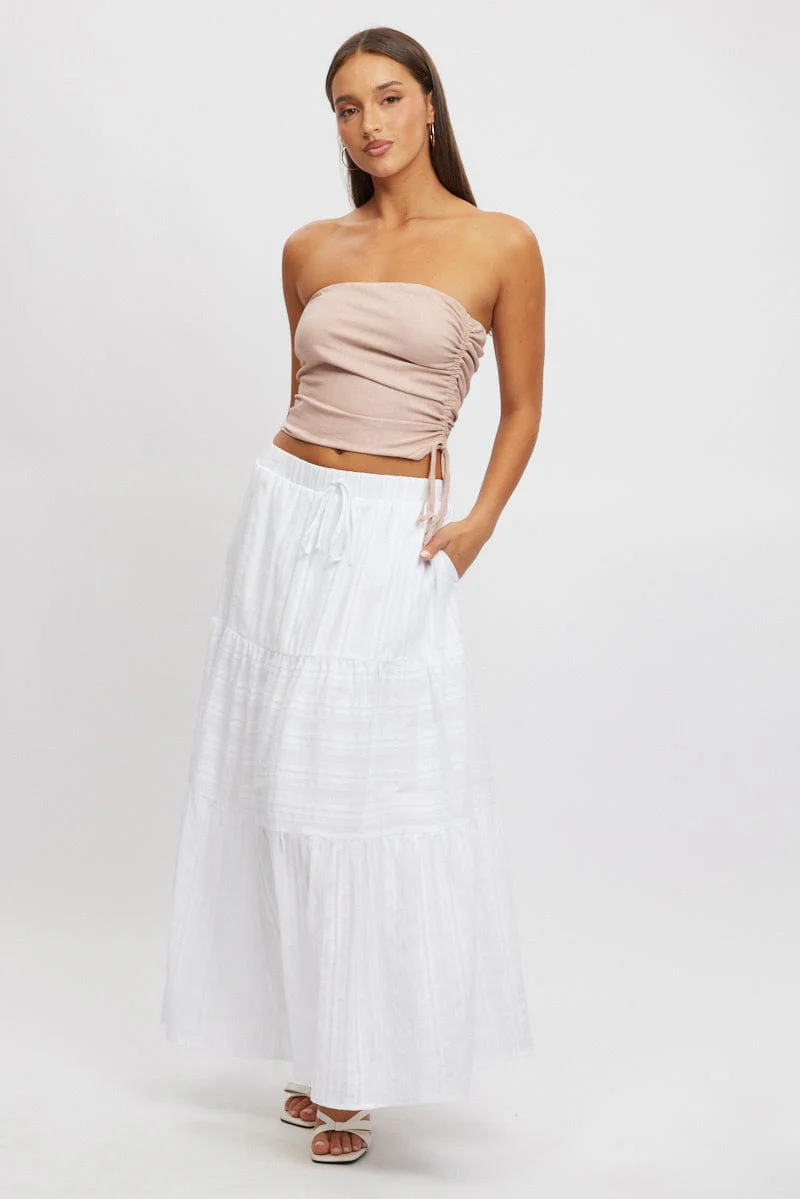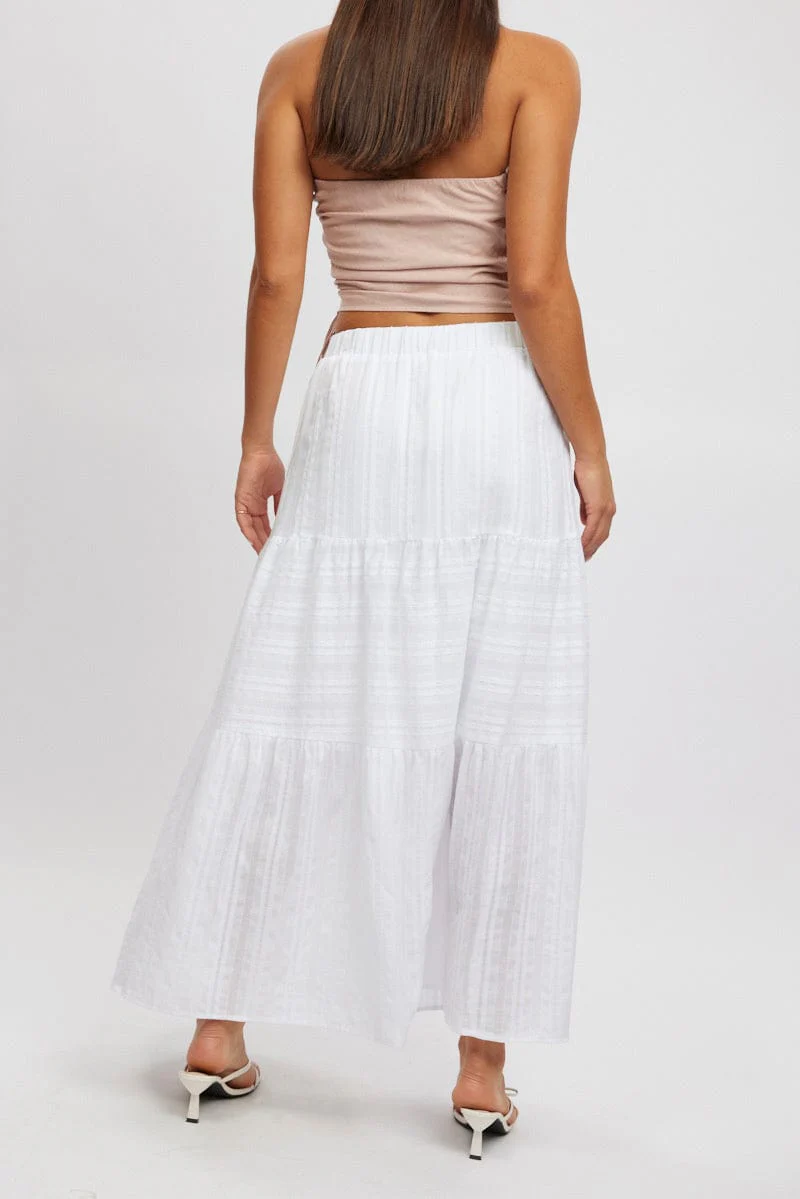 White Tiered Maxi Skirt High Rise Elastic Waist Lined