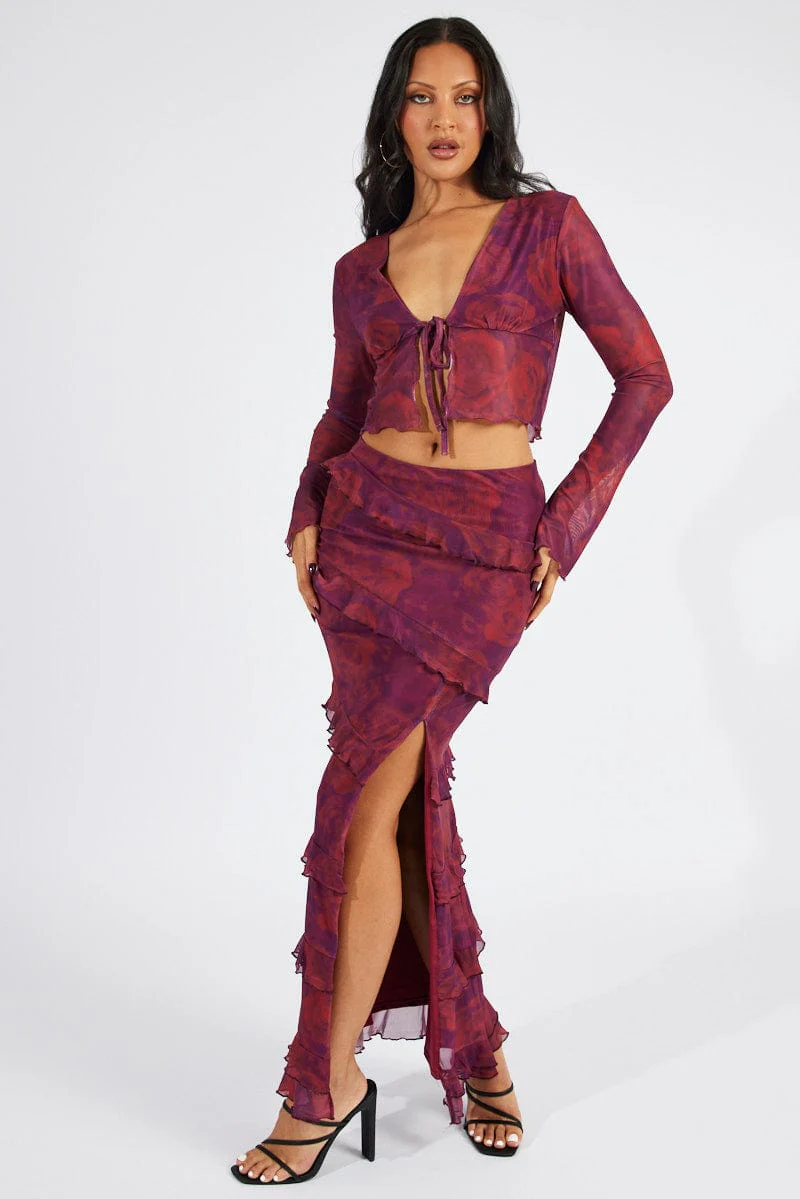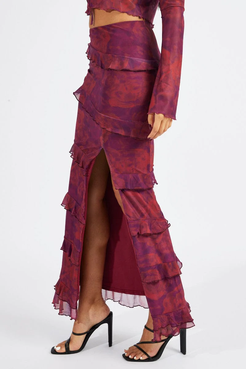 Red Floral Maxi Skirt Mesh Frilled Mesh
