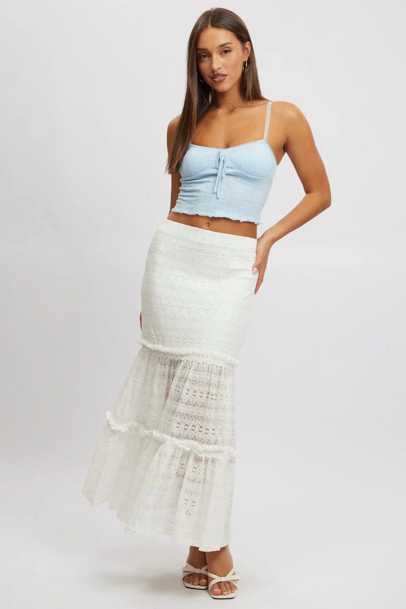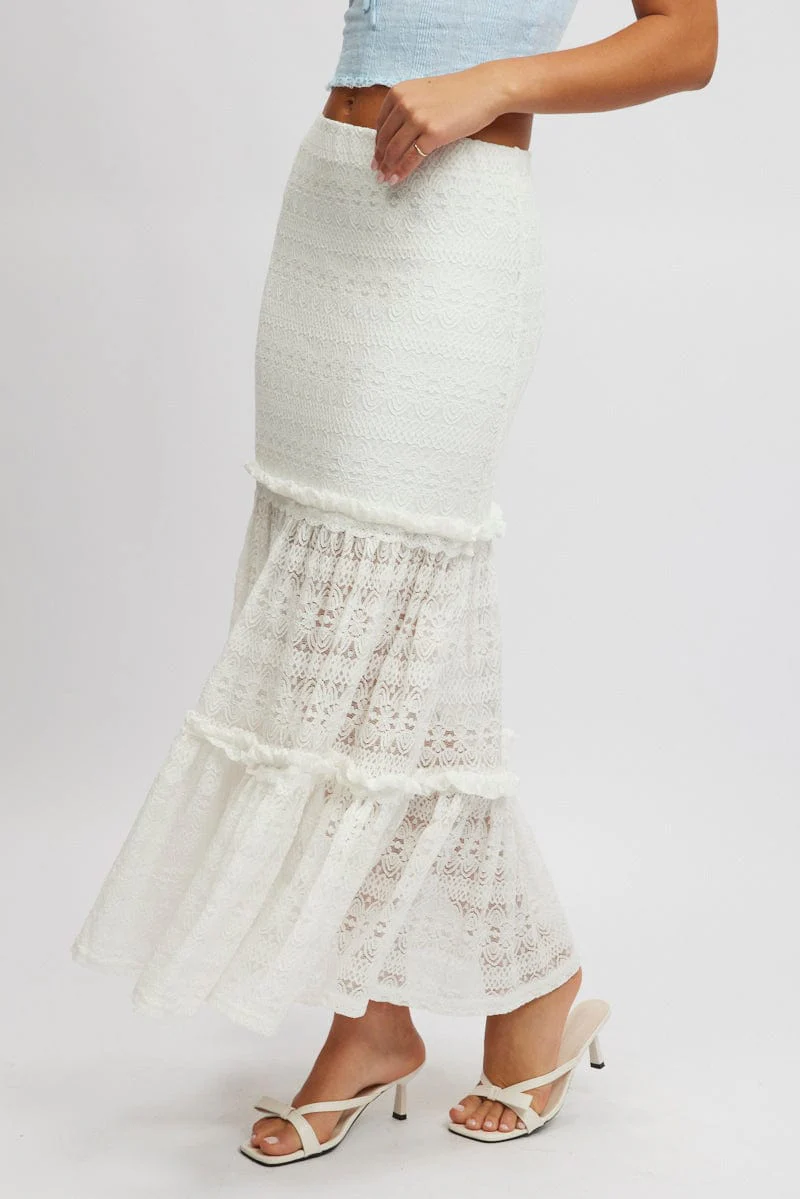 White Lace Maxi Skirt Elastic Waist Tiered Lined