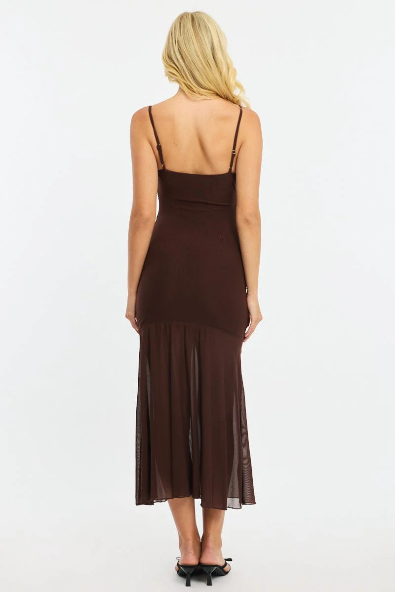 Brown Midi Dress Cut Out Mesh