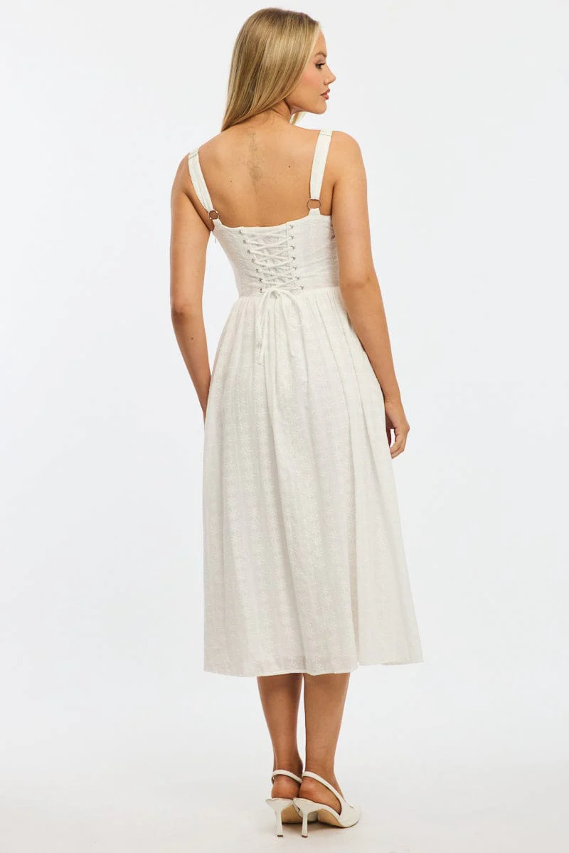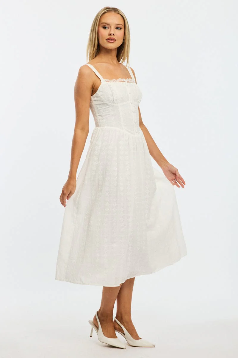 White Midi Dress Gathered Bust Lace Trim
