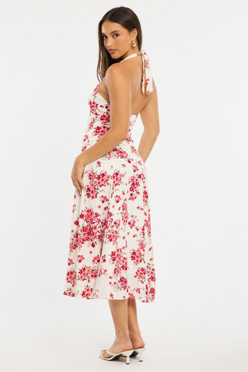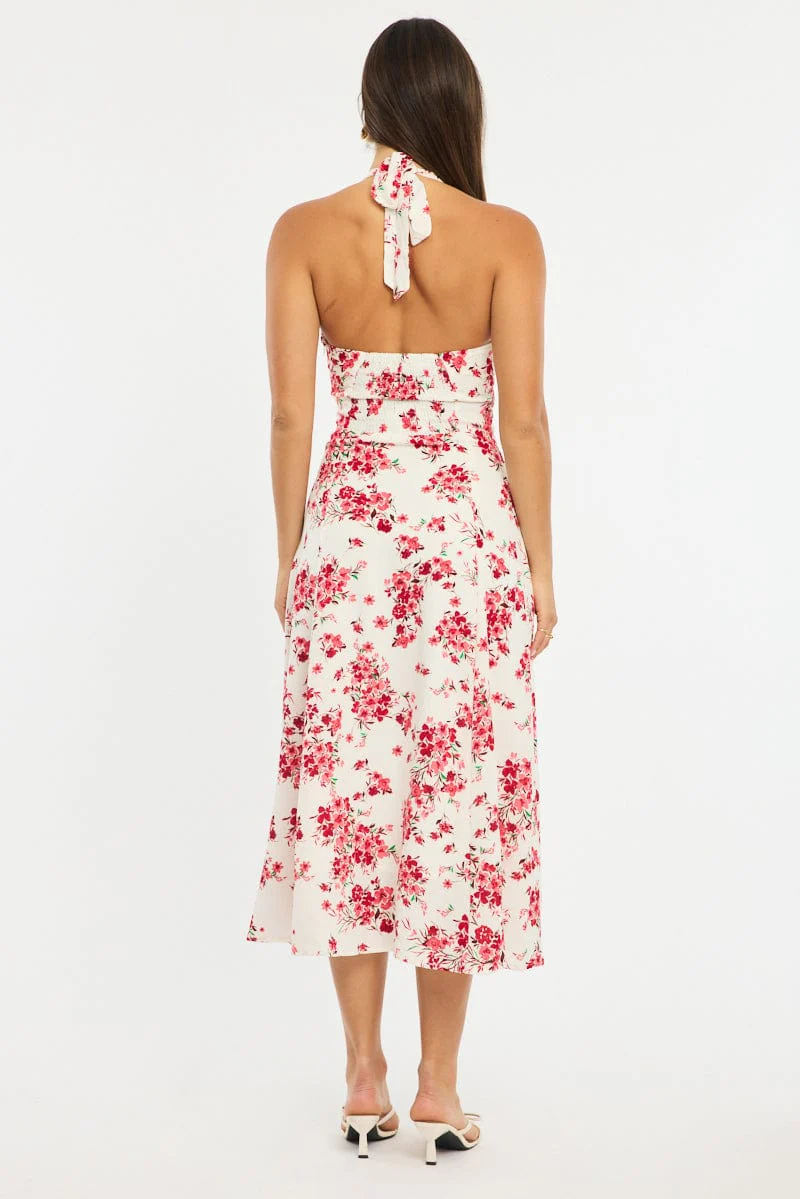 Red Floral Halter Neck Midi Dress