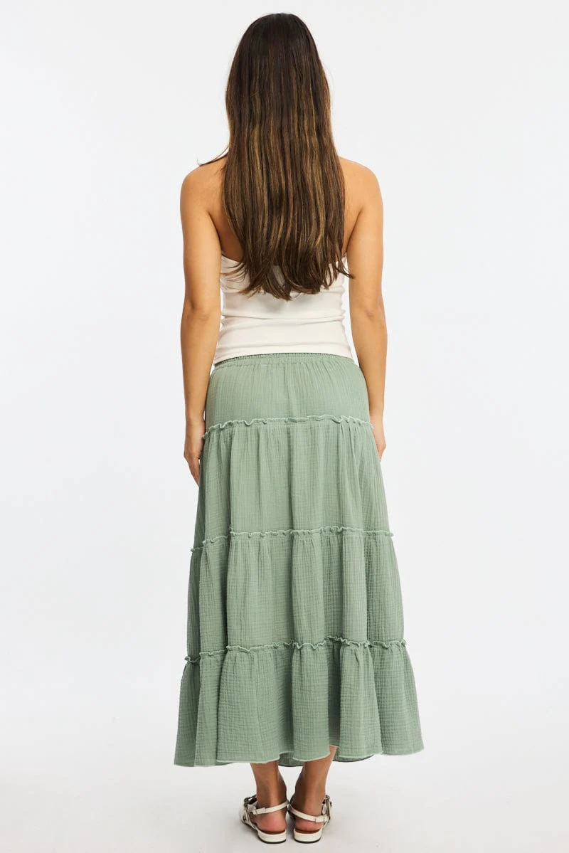 Green Midi Skirt Tiered High Rise Lined