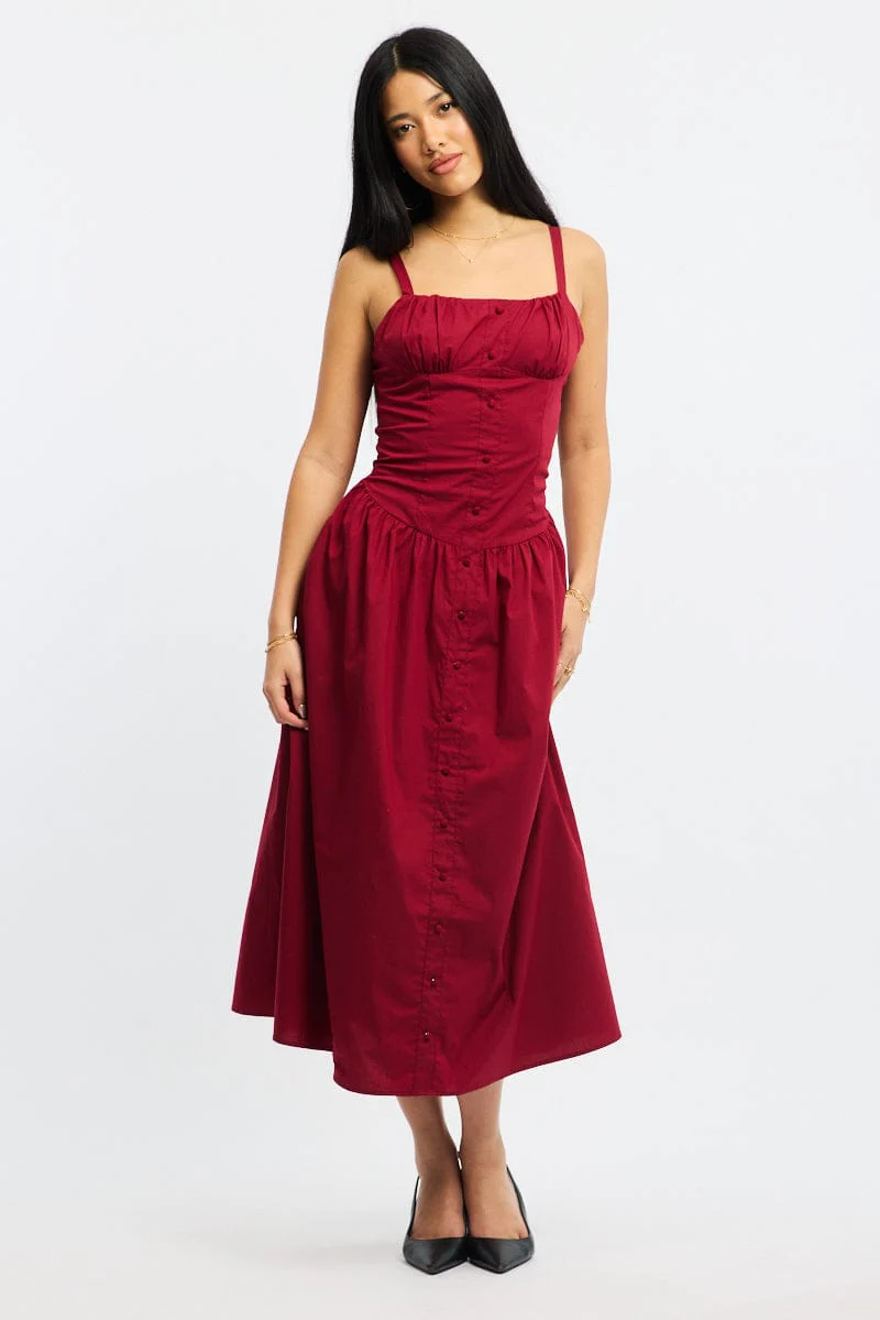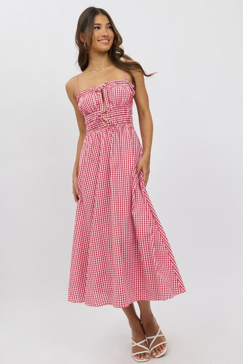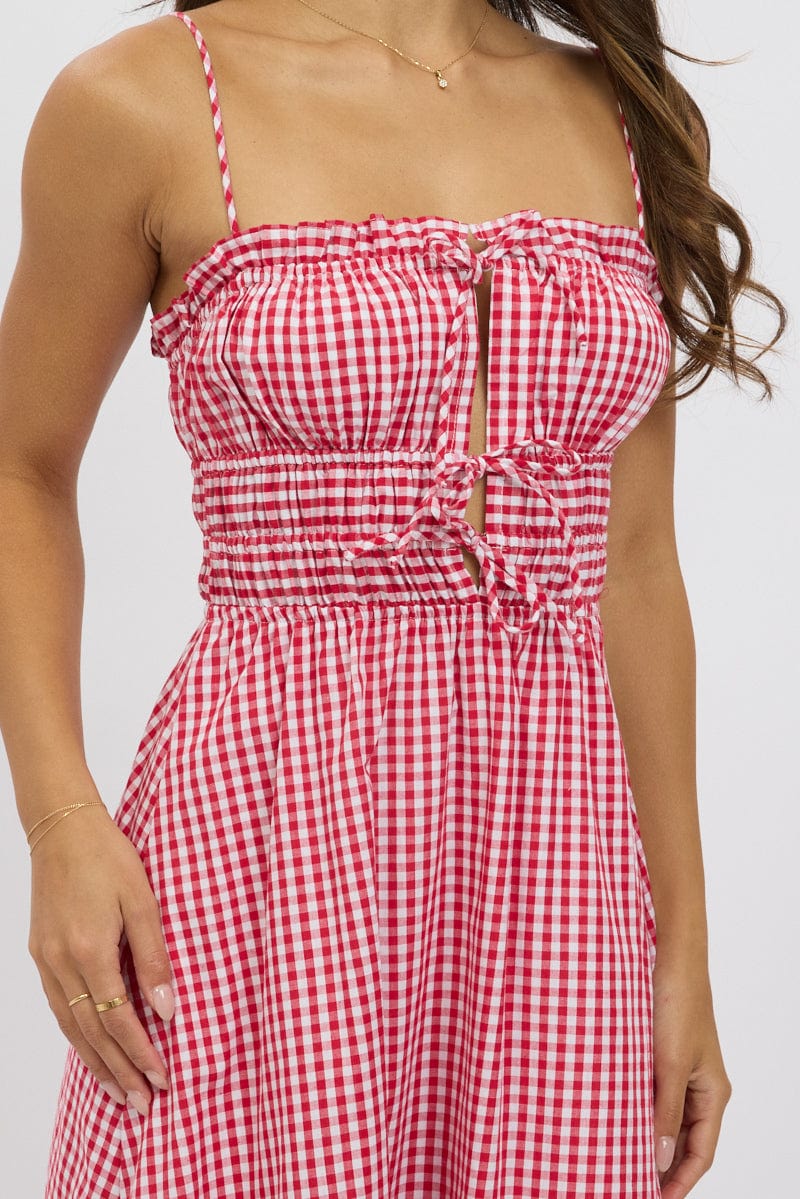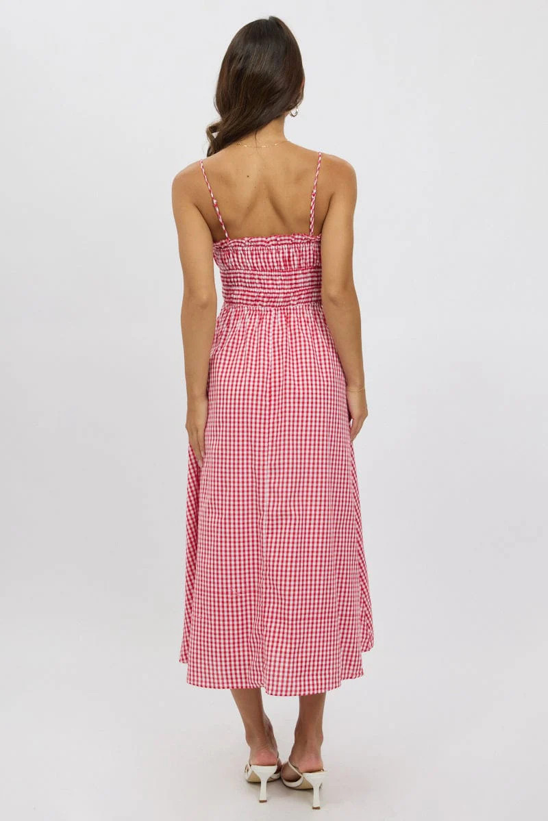 Red Check Asymmetric Midi Skirt Elastic Waist Frill Hem