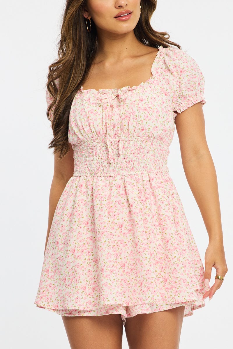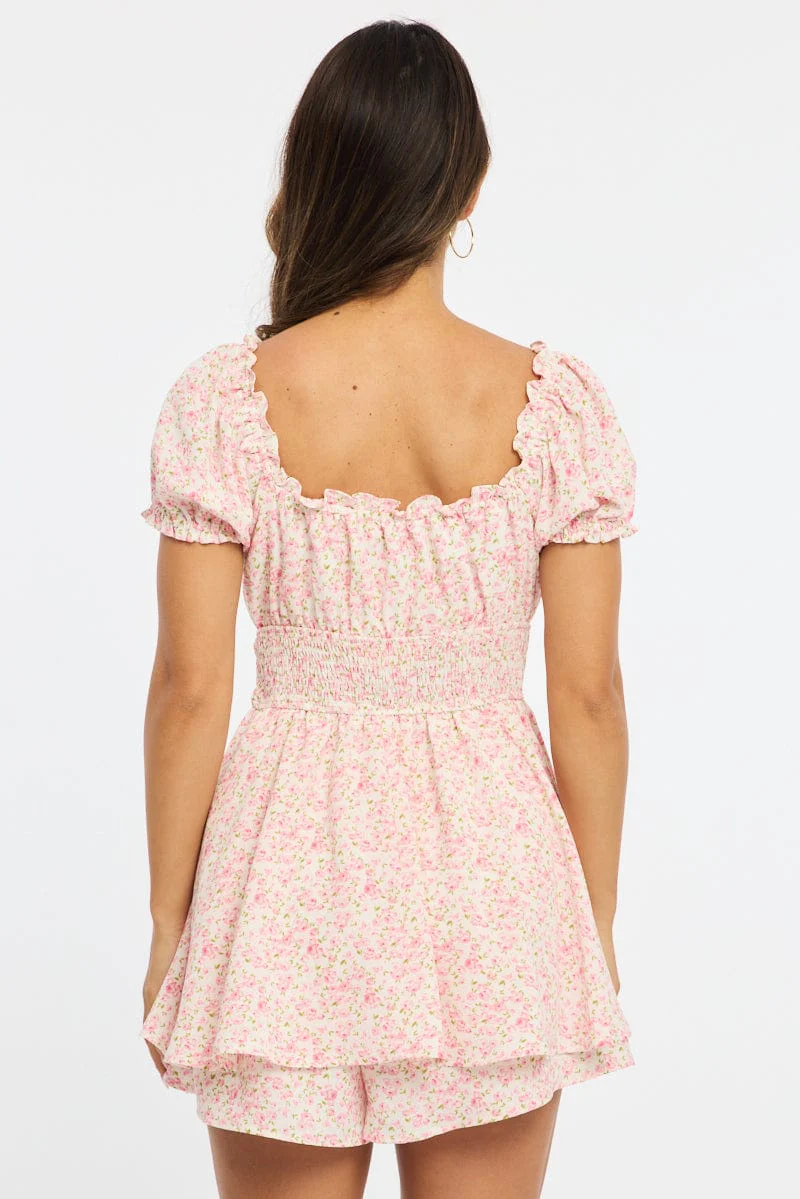 Pink Ditsy Playsuit Puff Sleeve Mini