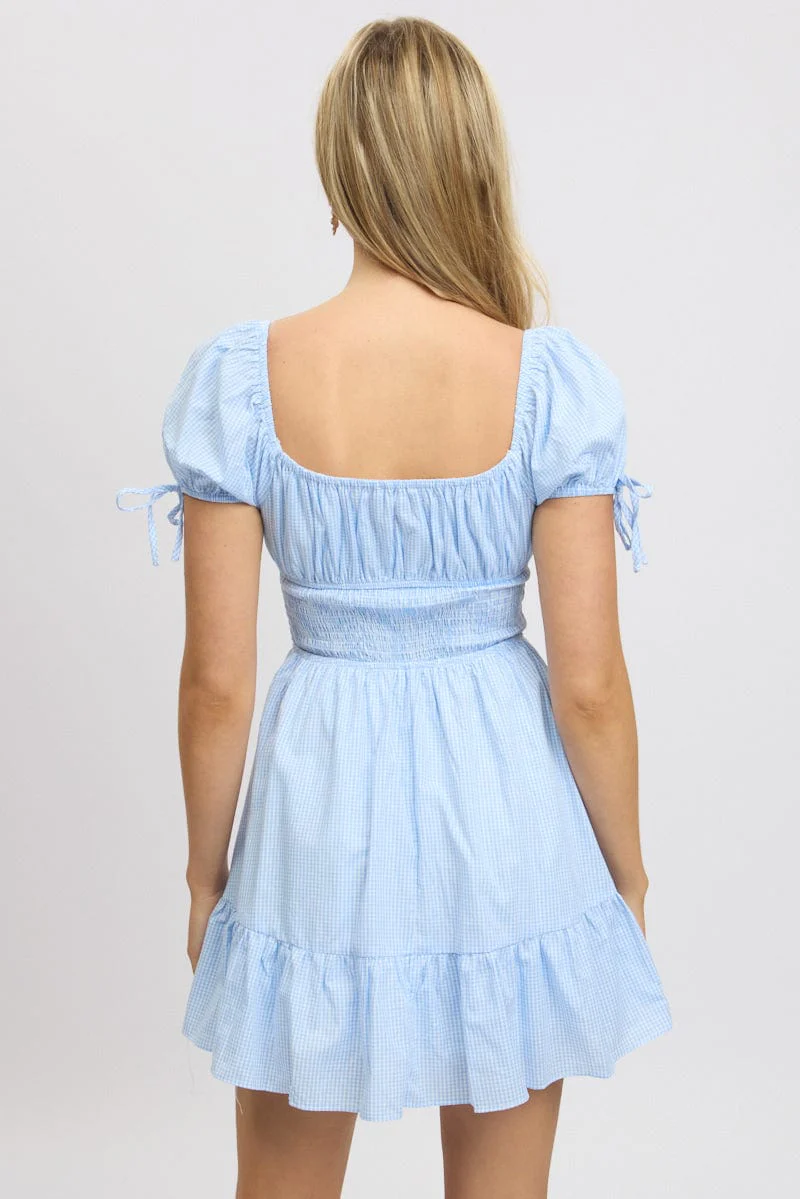 Blue Check Fit And Flare Dress Puff Sleeve Mini