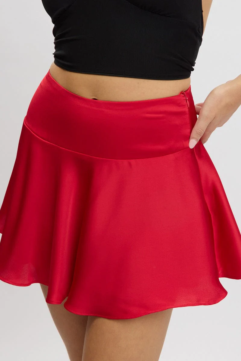 Red Satin Skirt High Rise Mini Flowy Skater