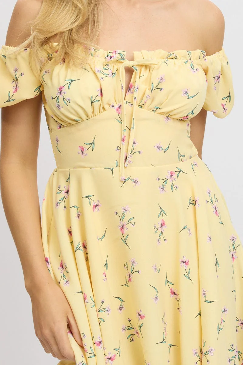 Yellow Floral Fit And Flare Dress Mini