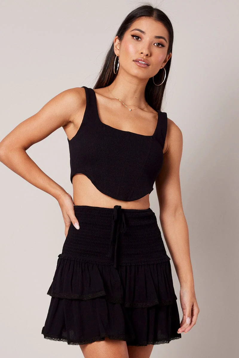 Black Skater Skirt Smocking Waist Mini
