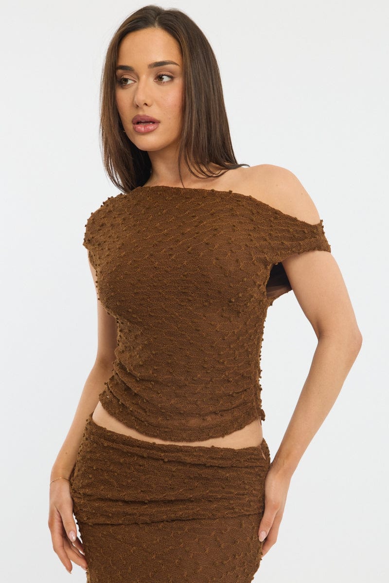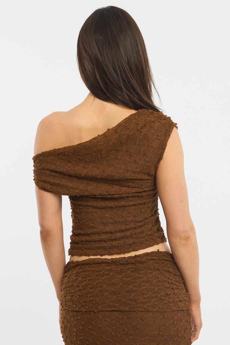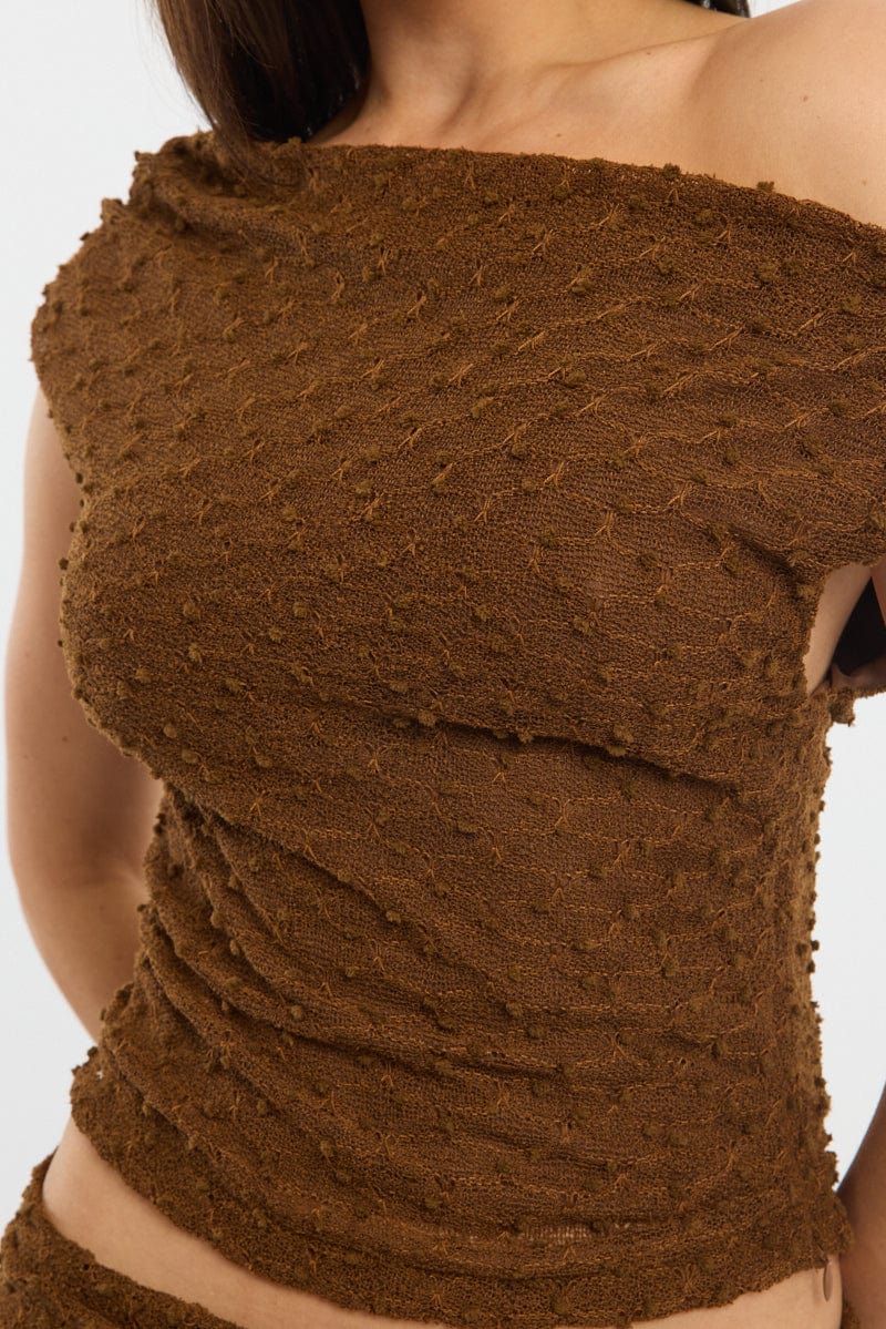 Brown Asymmetric Top Sleeveless One Shoulder Textured