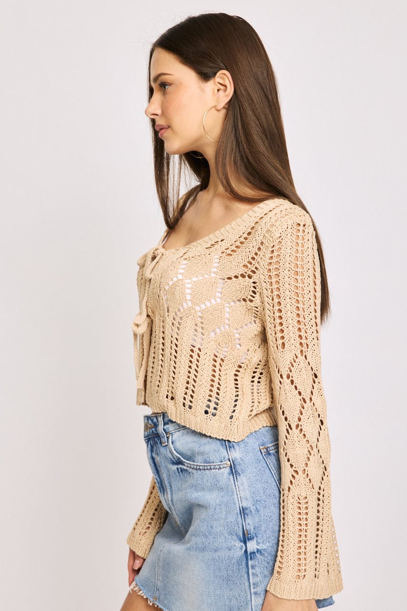 Beige Knit Cardigan Long Sleeve Crochet