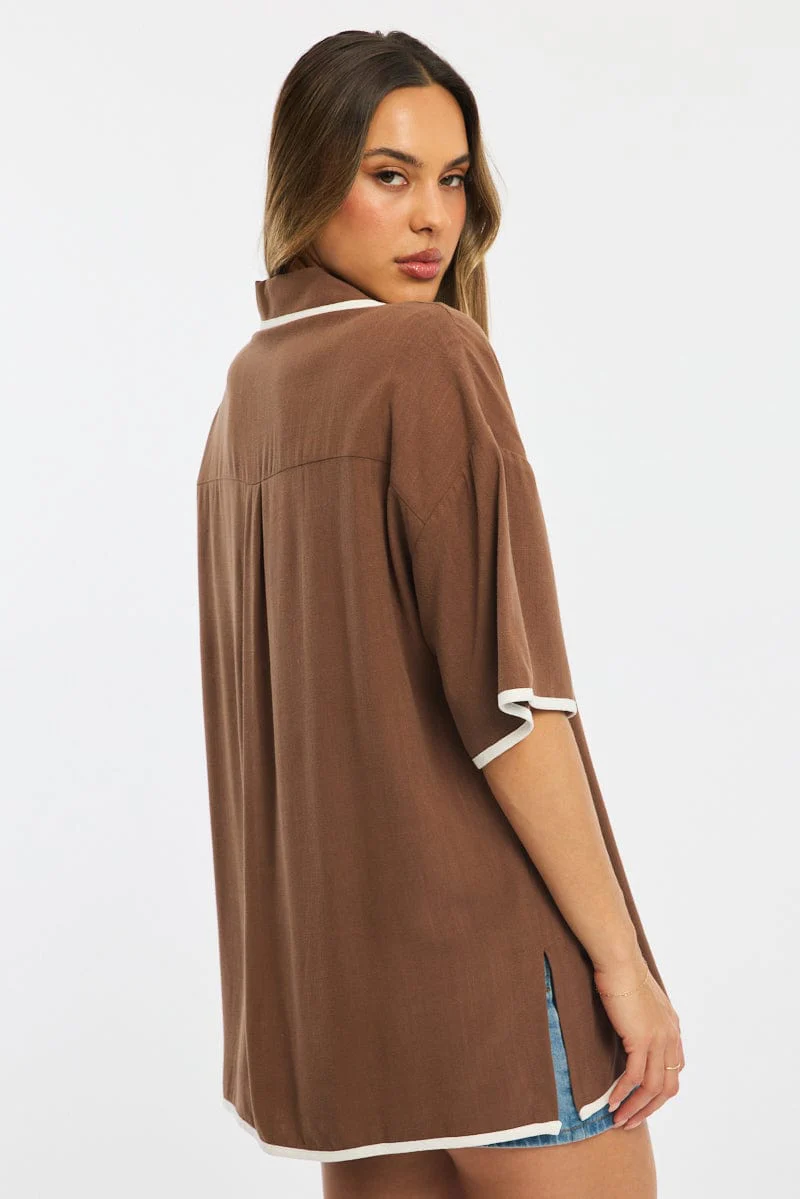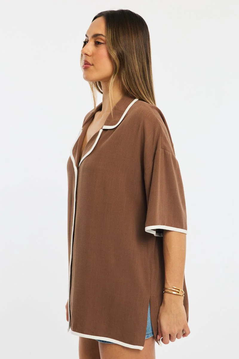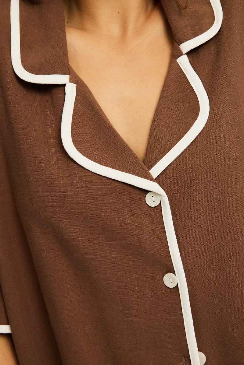 Brown Bias Lapel Shirt Short Sleeve Relaxed Linen Blend