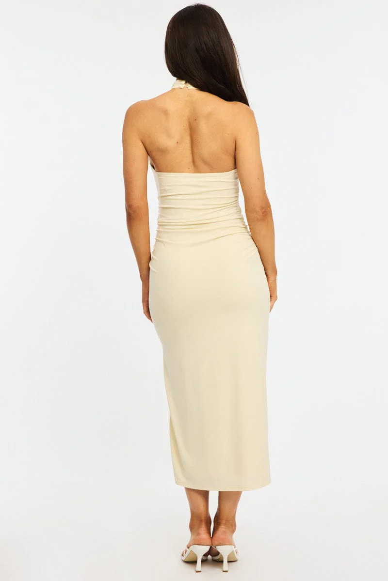 Yellow Bodycon Dress High Neck Side Ruched
