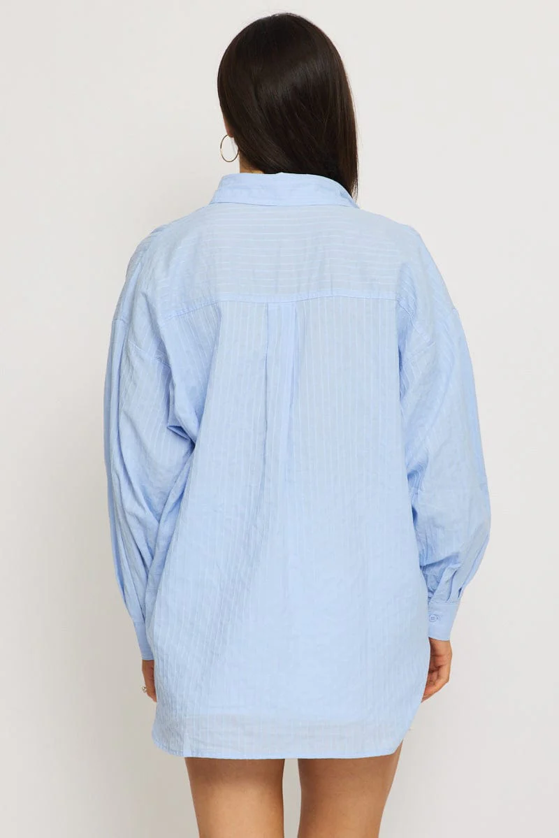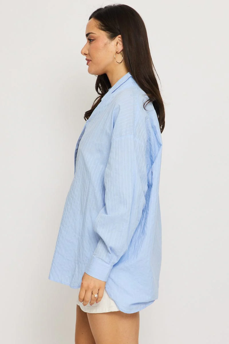 Blue Long Sleeve Shirt Button Up Collared Self-striped
