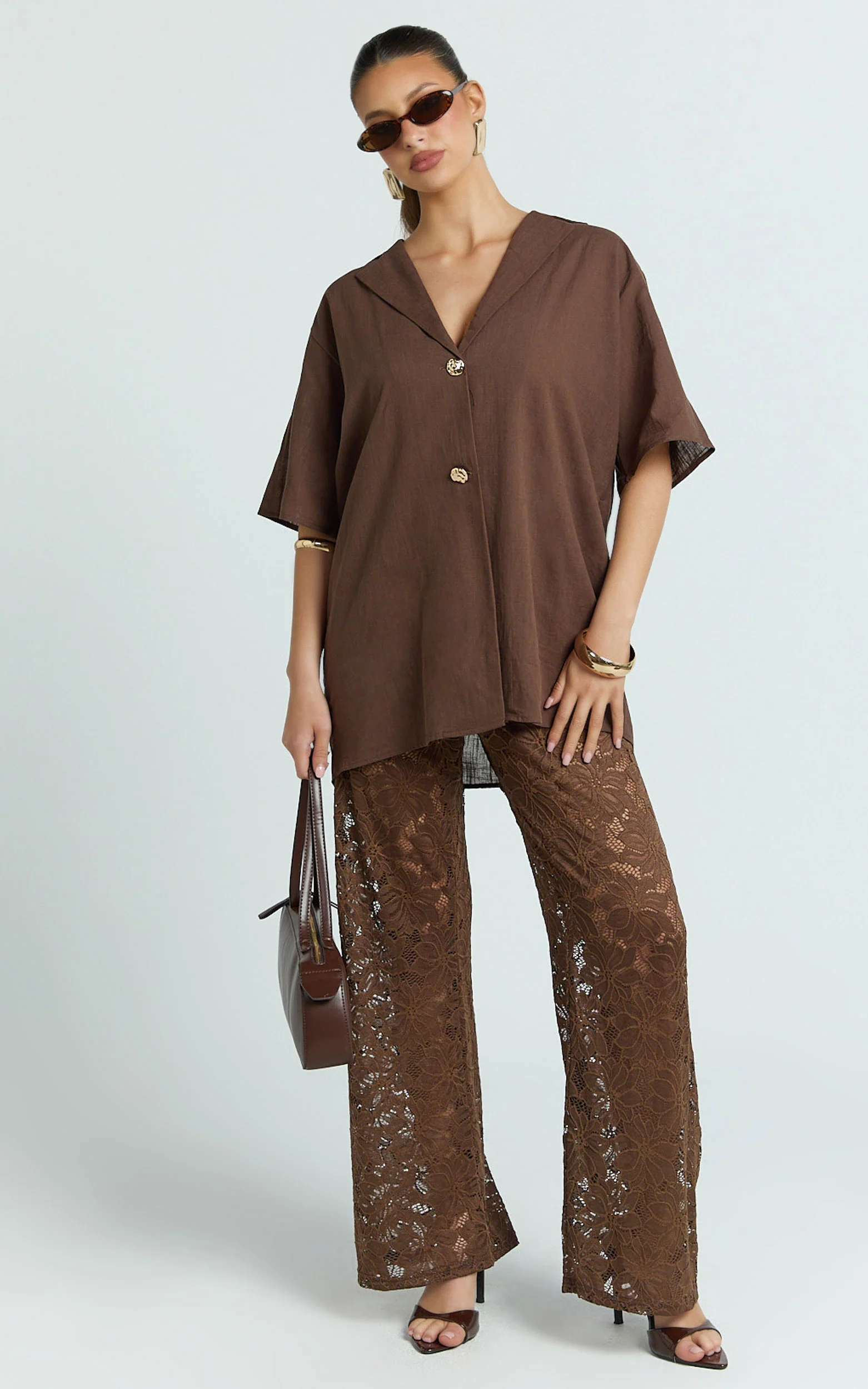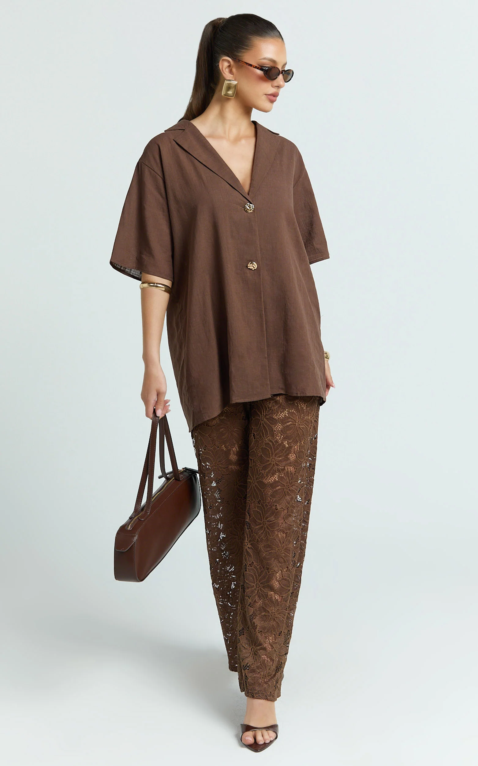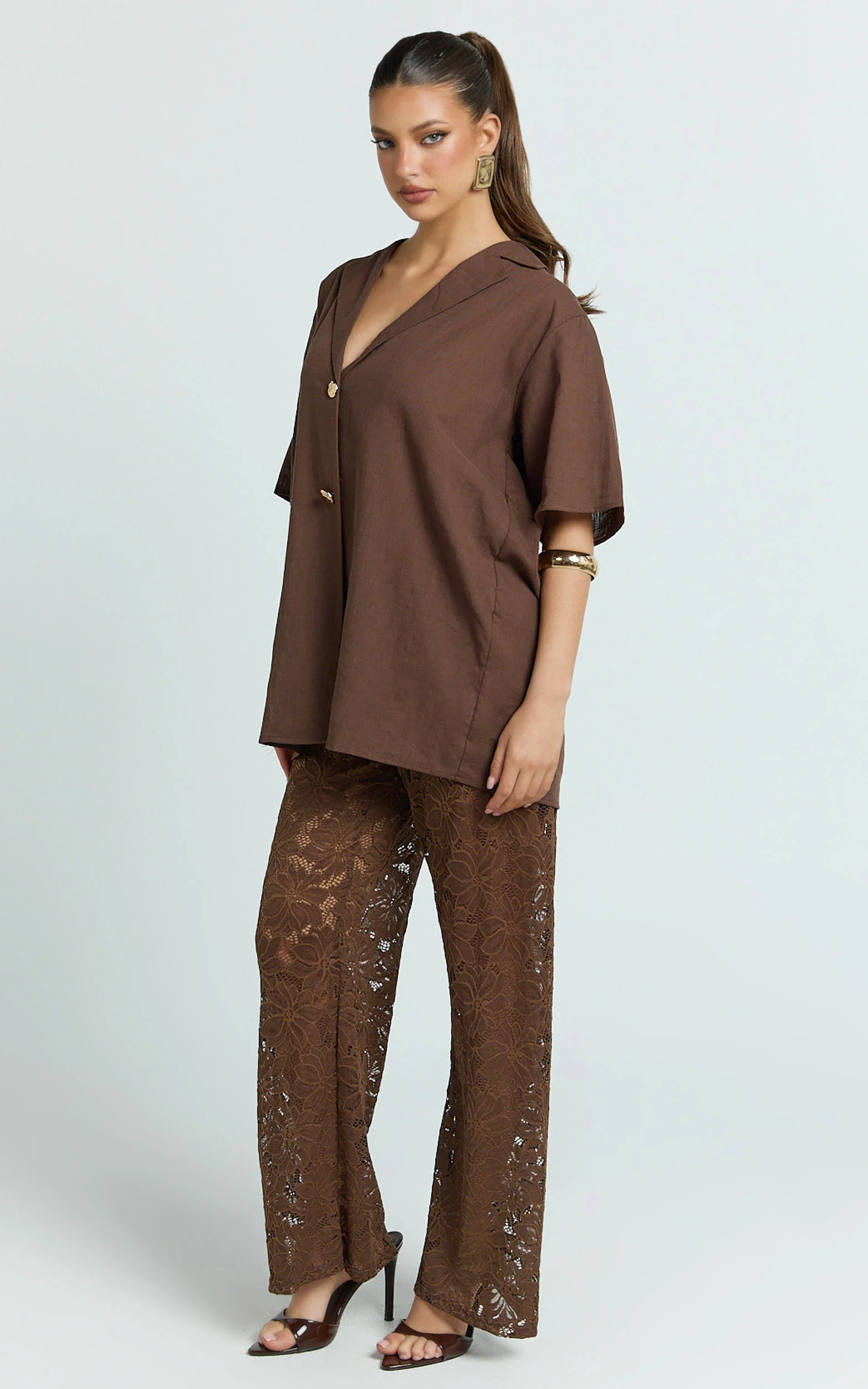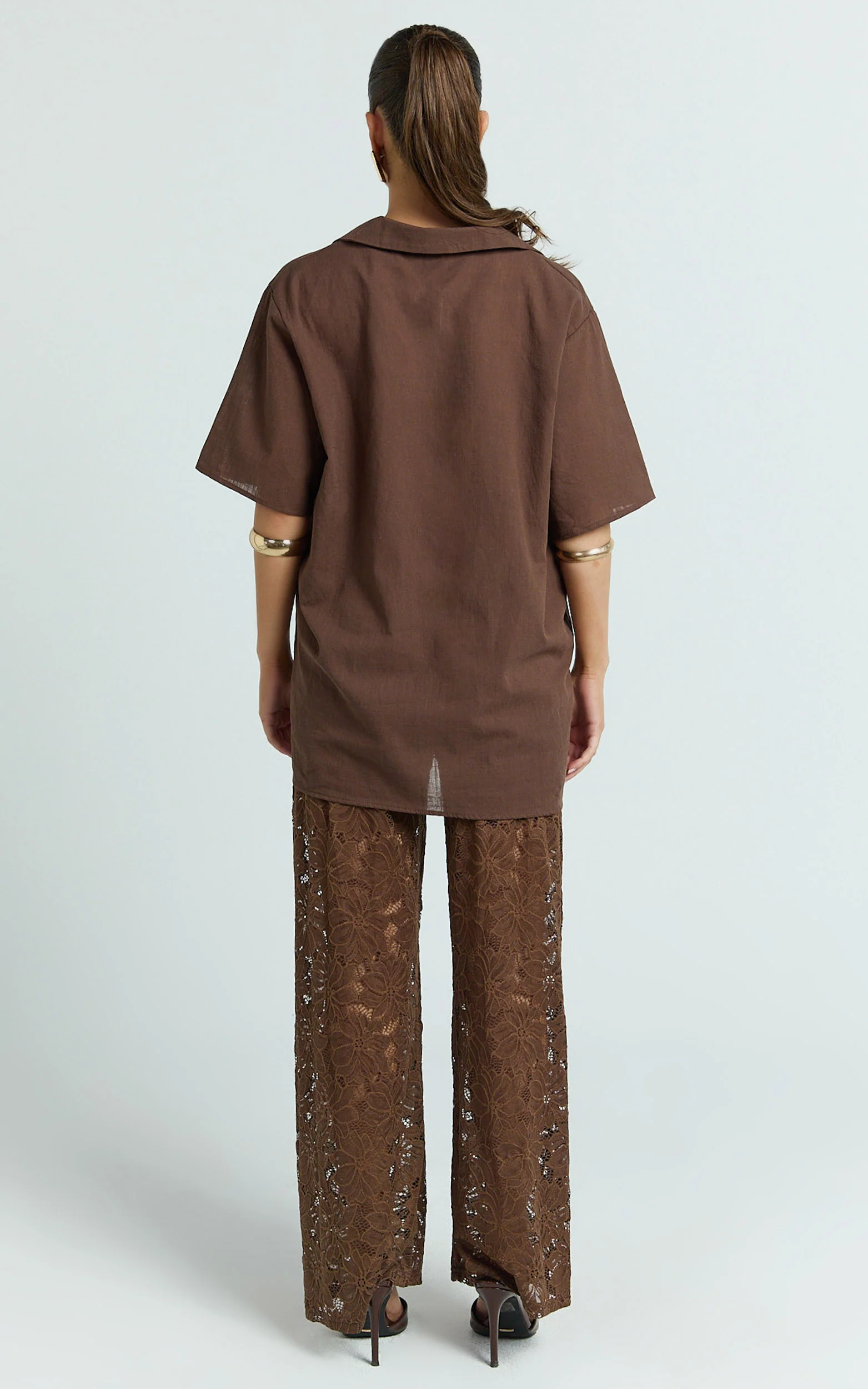 Jemma Two Piece Set - Relaxed Shirt and Lace Pants Set in Choc