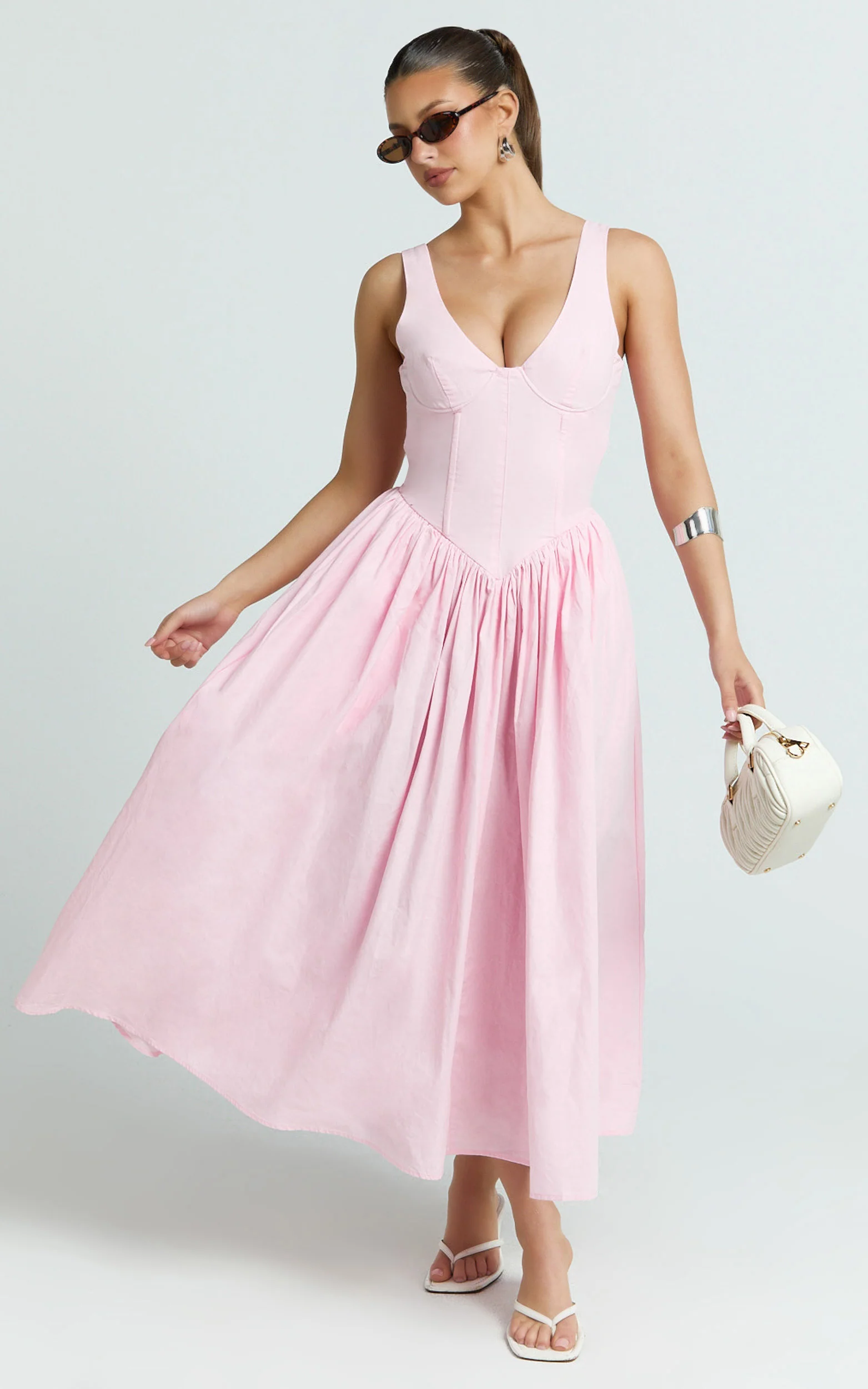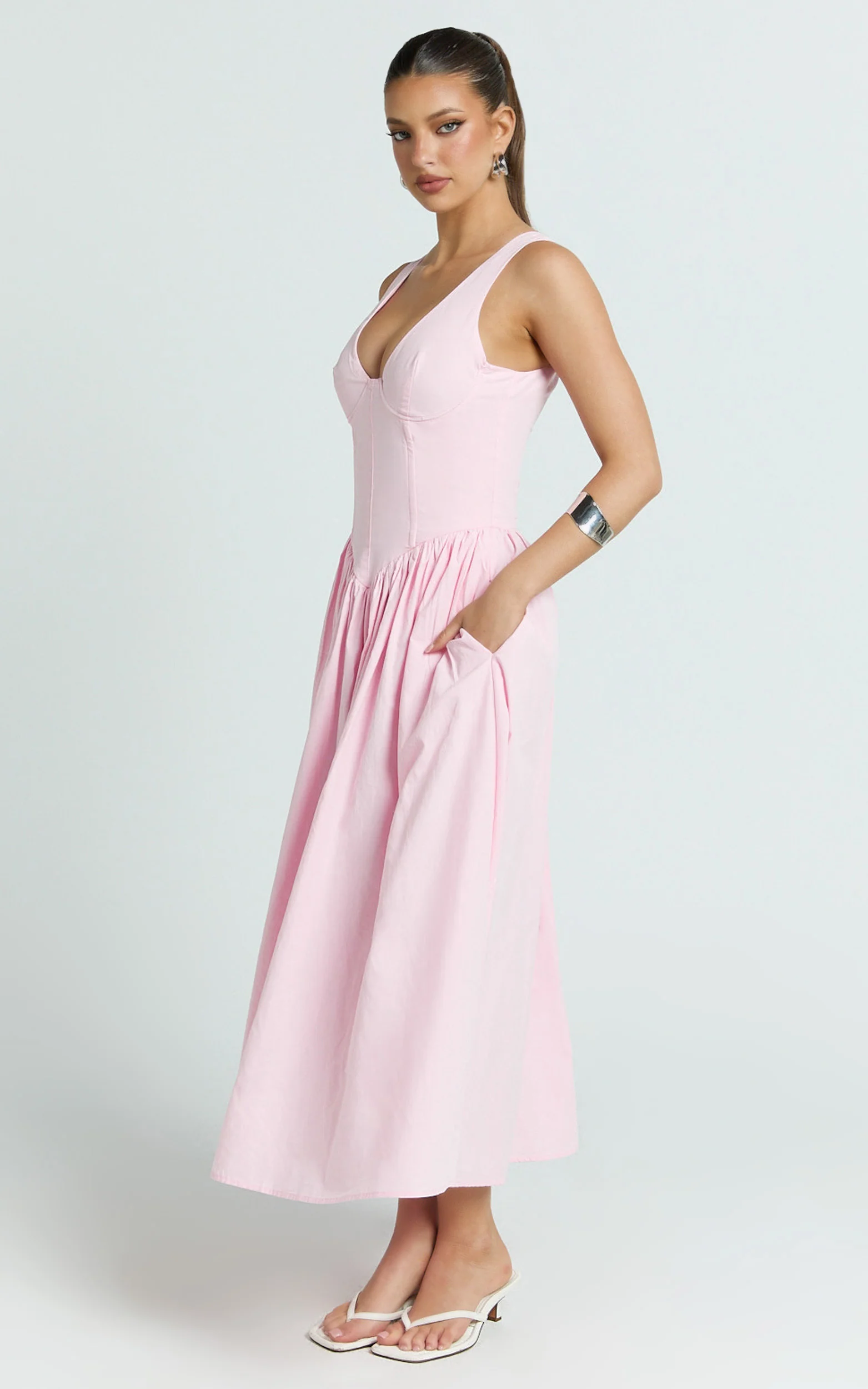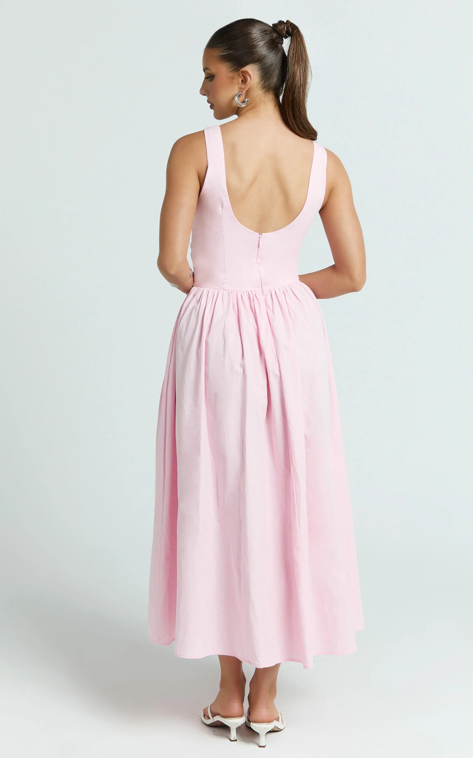 Beckett Midi Dress - Scoop Neck Drop V Waist Gathered Skirt Dress in Pink