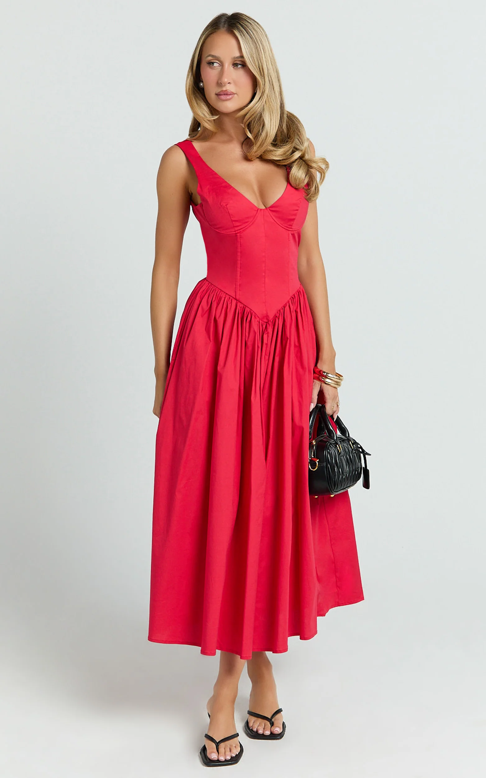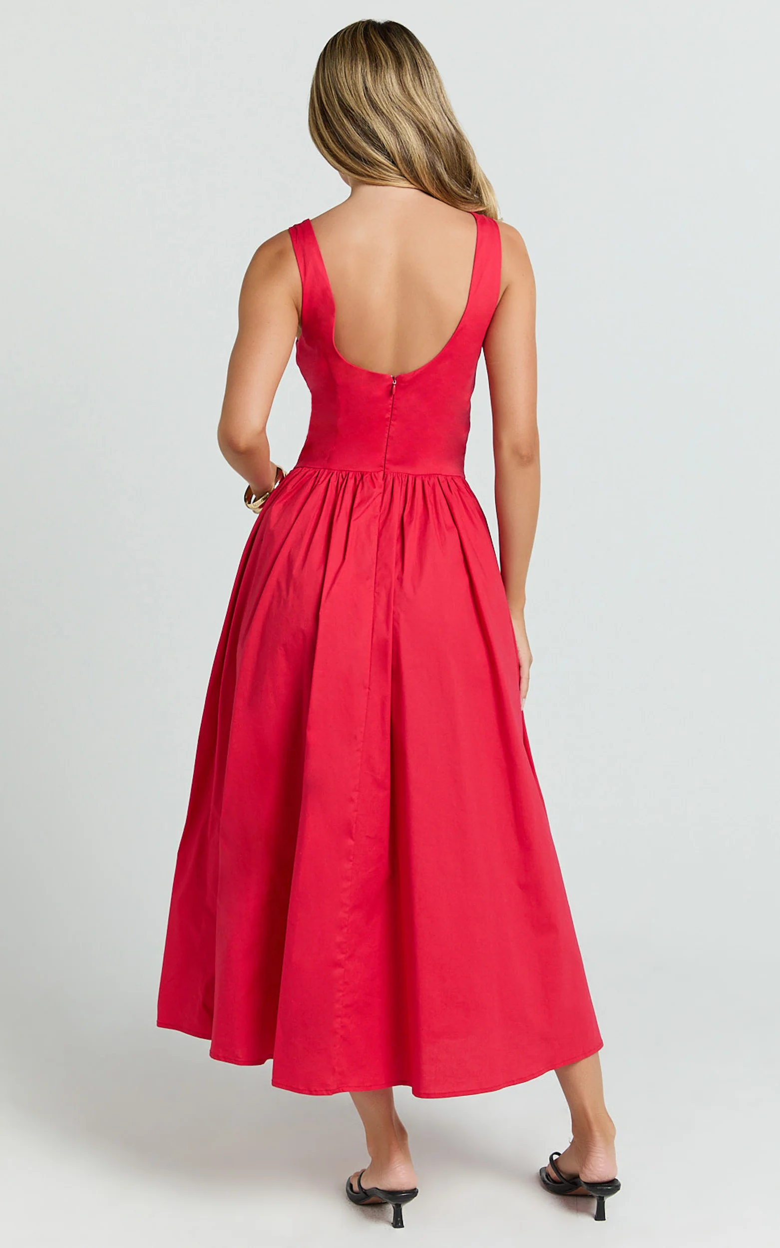 Beckett Midi Dress - Scoop Neck Drop V Waist Gathered Skirt Dress in Red