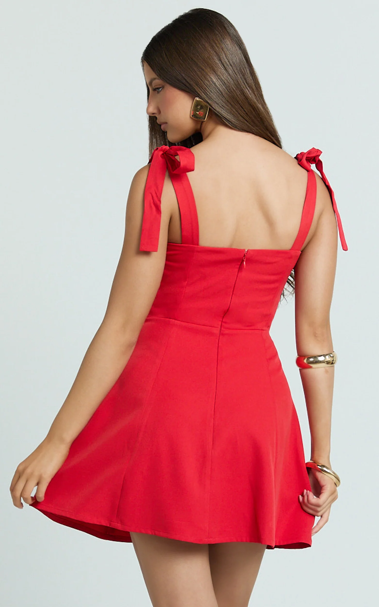 Inez Mini Dress - Gathered Bust A Line Shoulder Tie Dress in Red