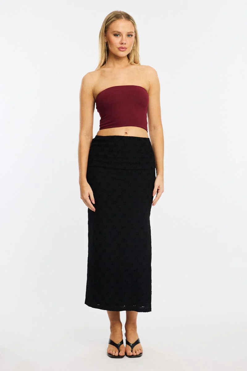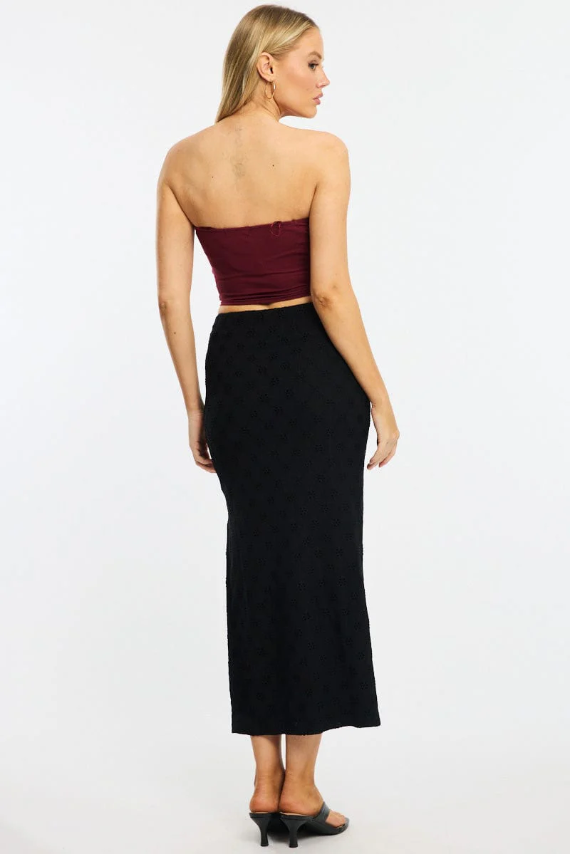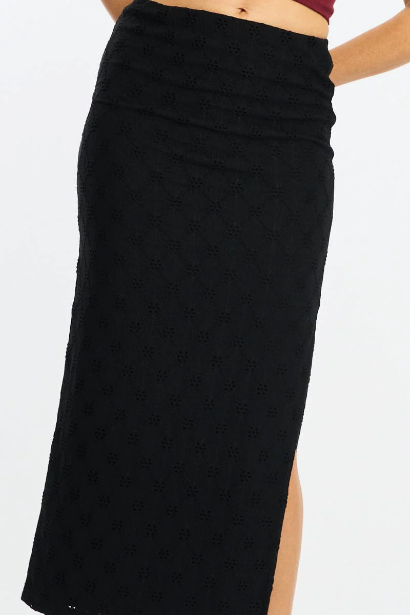 Black Midaxi Skirt Elastic Waisthigh Rise Stretch Eyelet