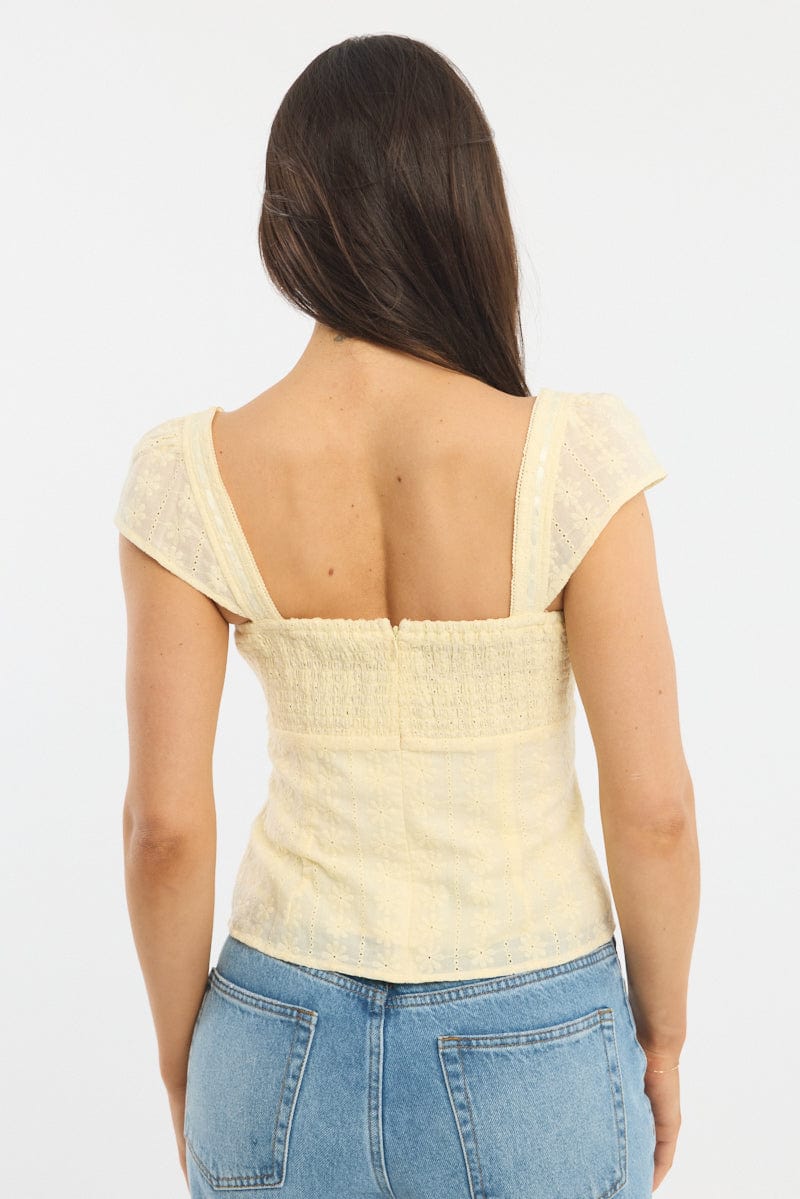 Yellow Eyelet Top Cap Sleeve Sweetheart Neckline Broderie