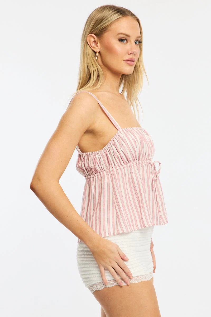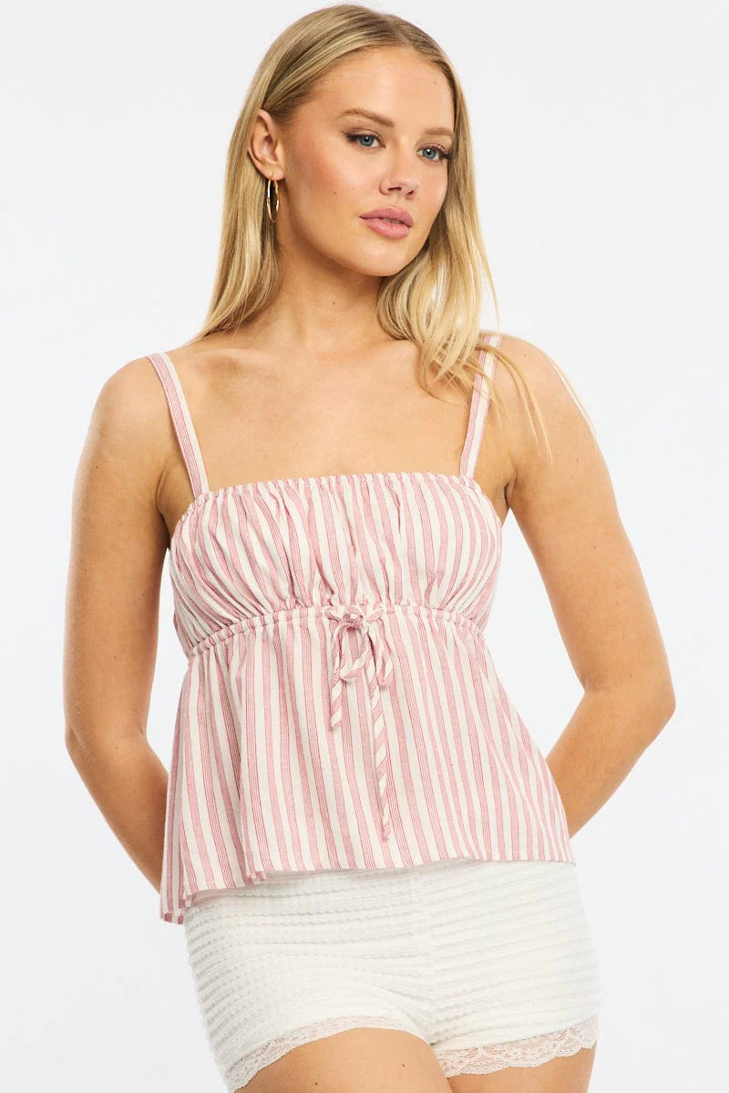 Red Stripe Cami Top Sleeveless Front Tie Babydoll