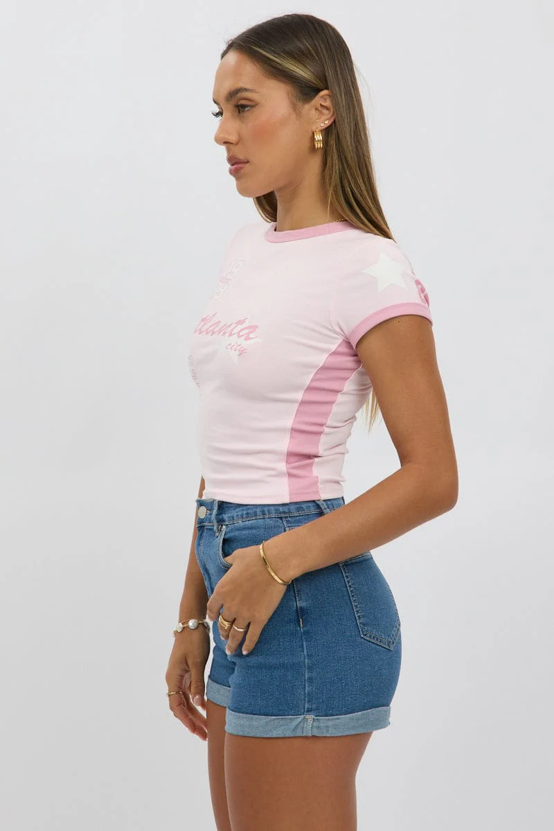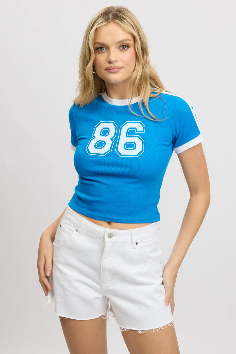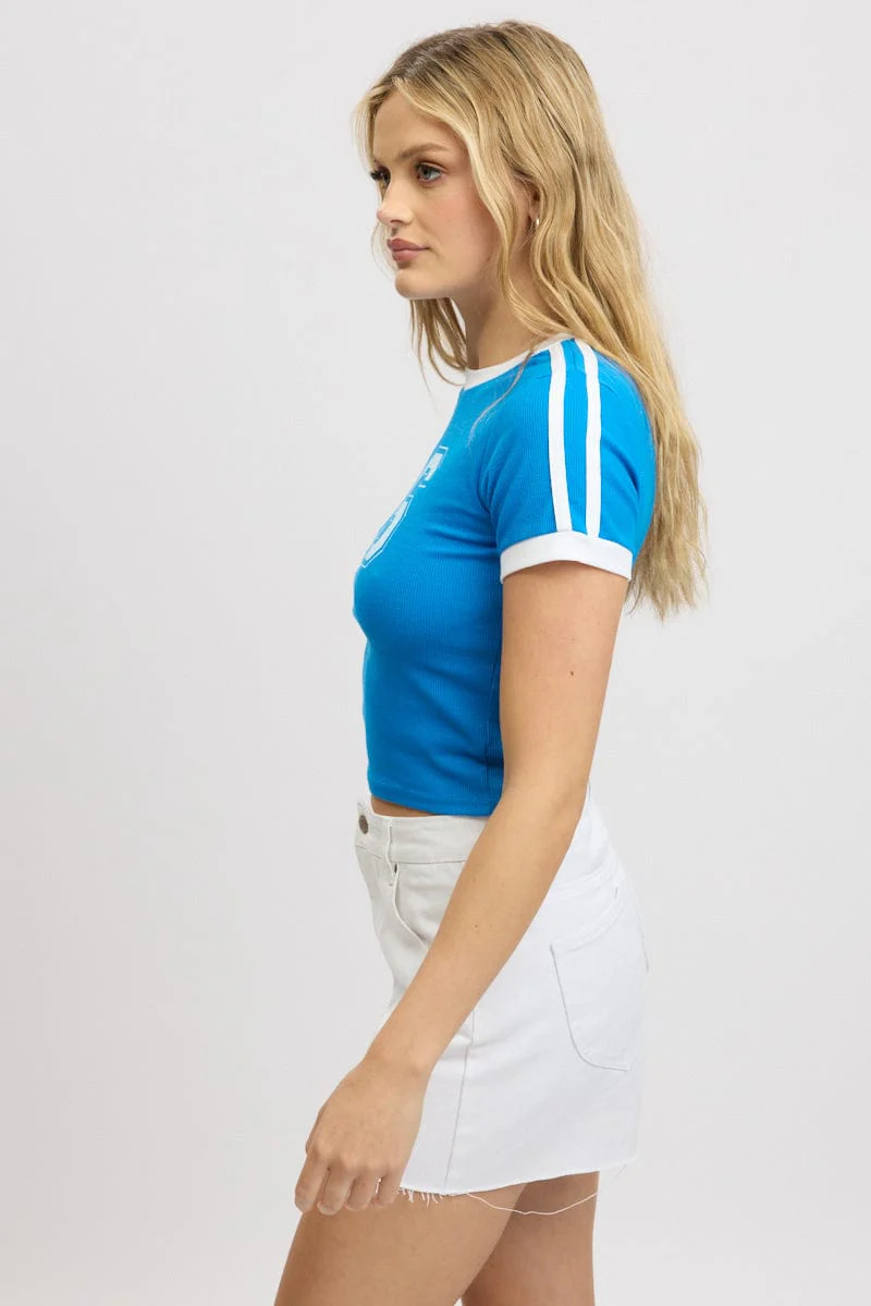 Blue Graphic Tee Short Sleeve Contrast Binding