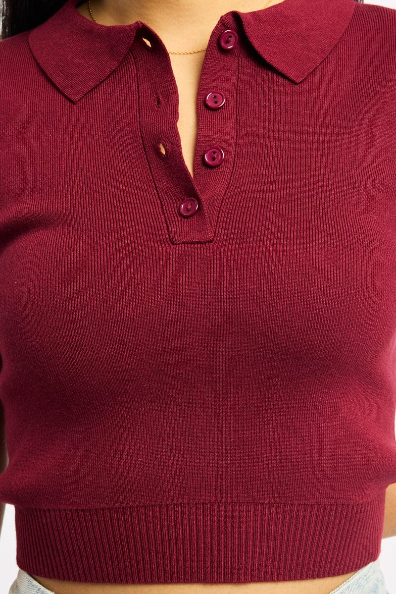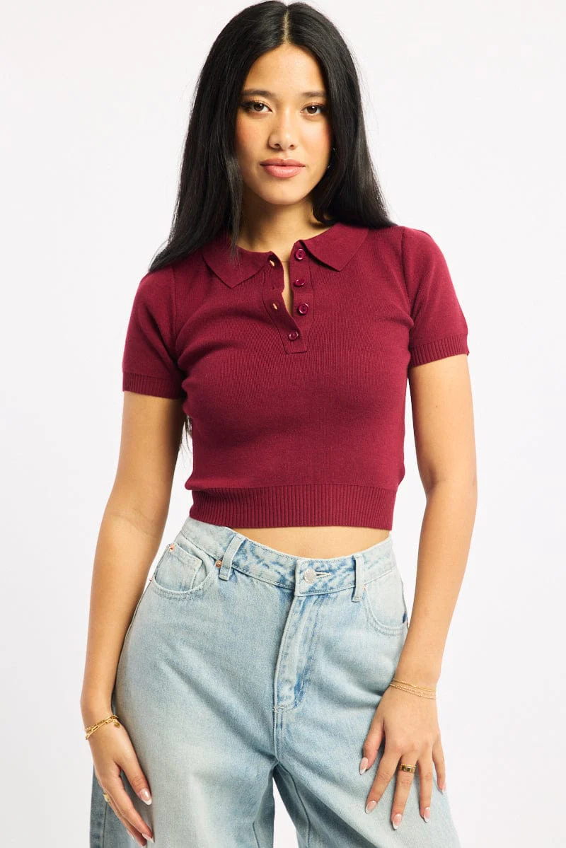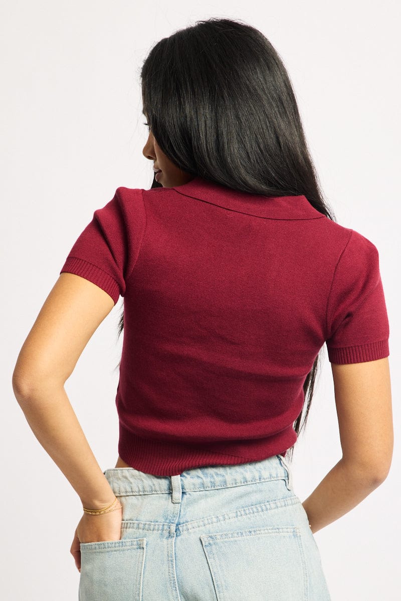 Red Knit Top Short Sleeve Polo Collar