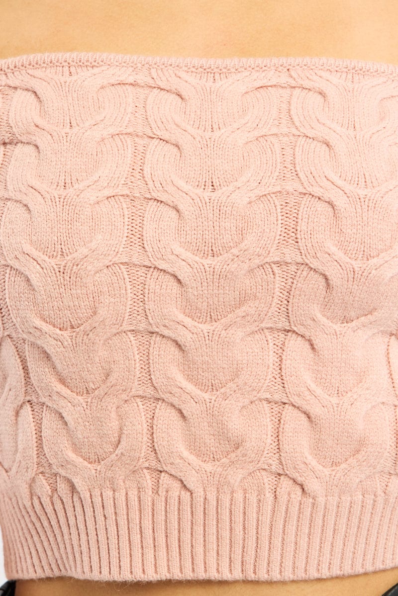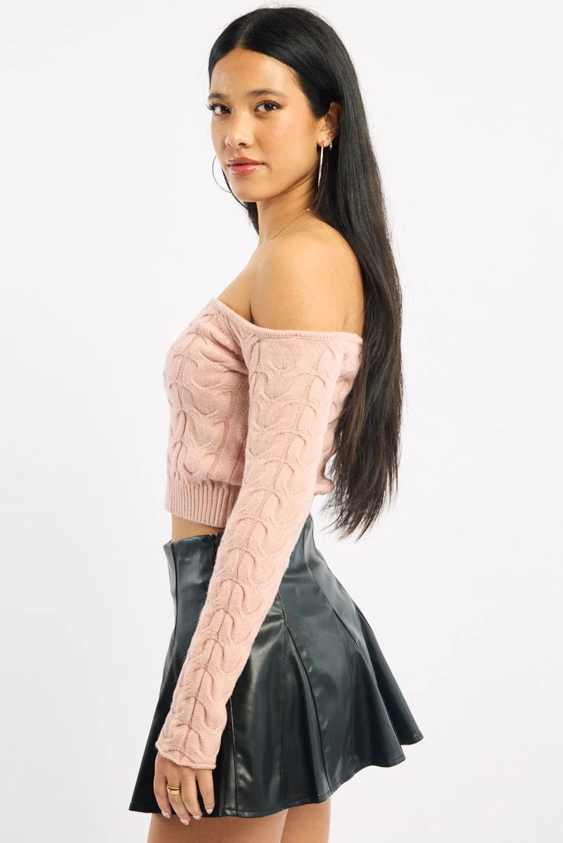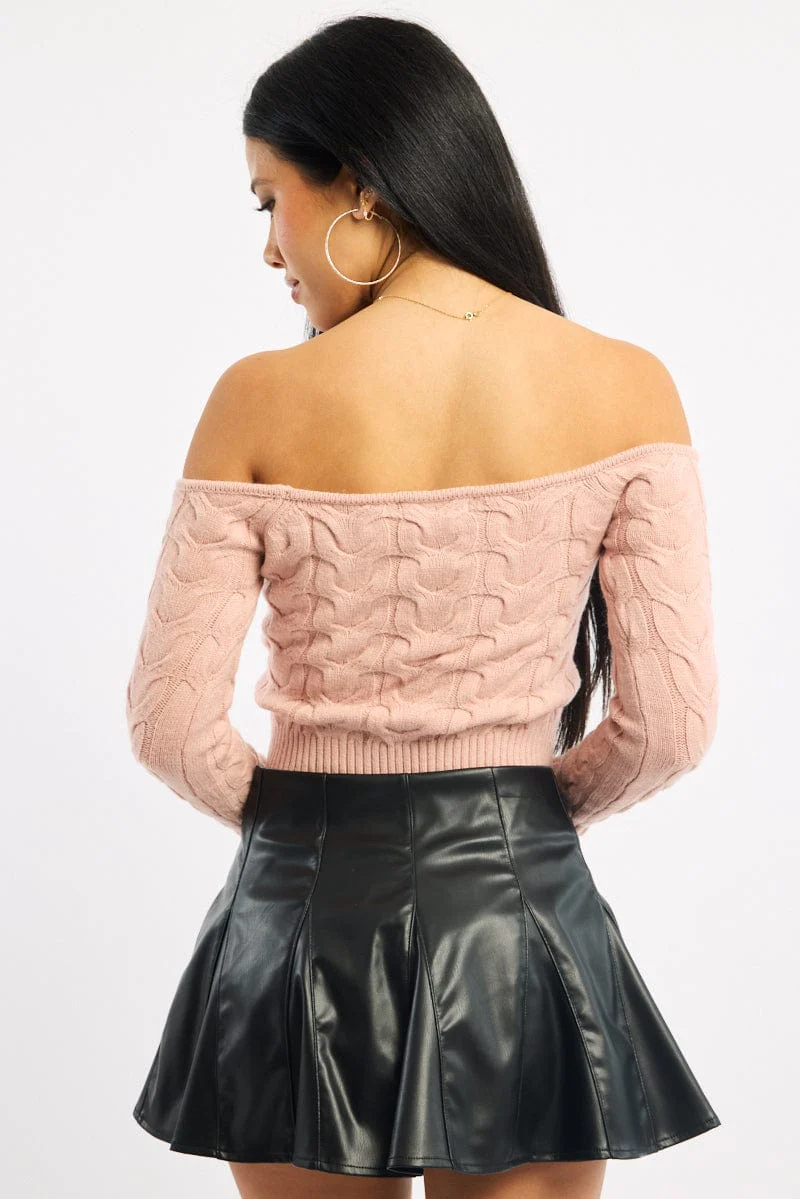 Pink Cable Knit Top Long Sleeve Off Shoulder