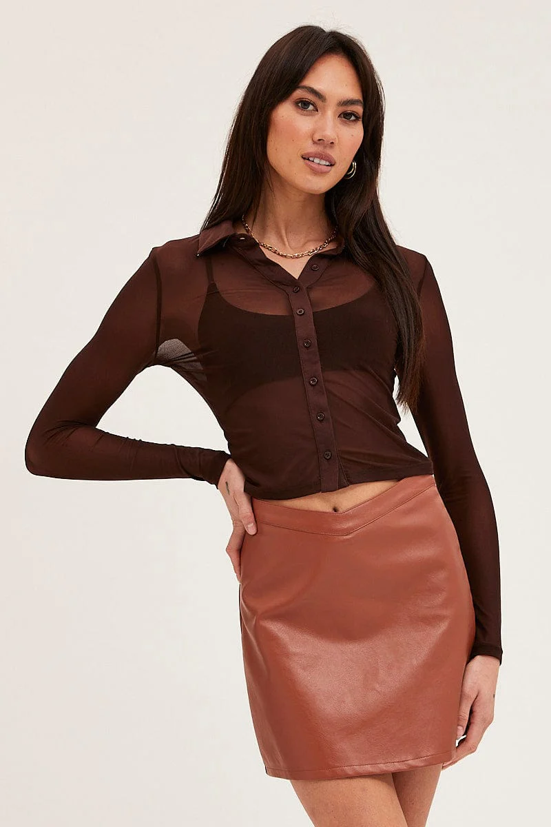 Brown Button Front Top Long Sleeve Mesh