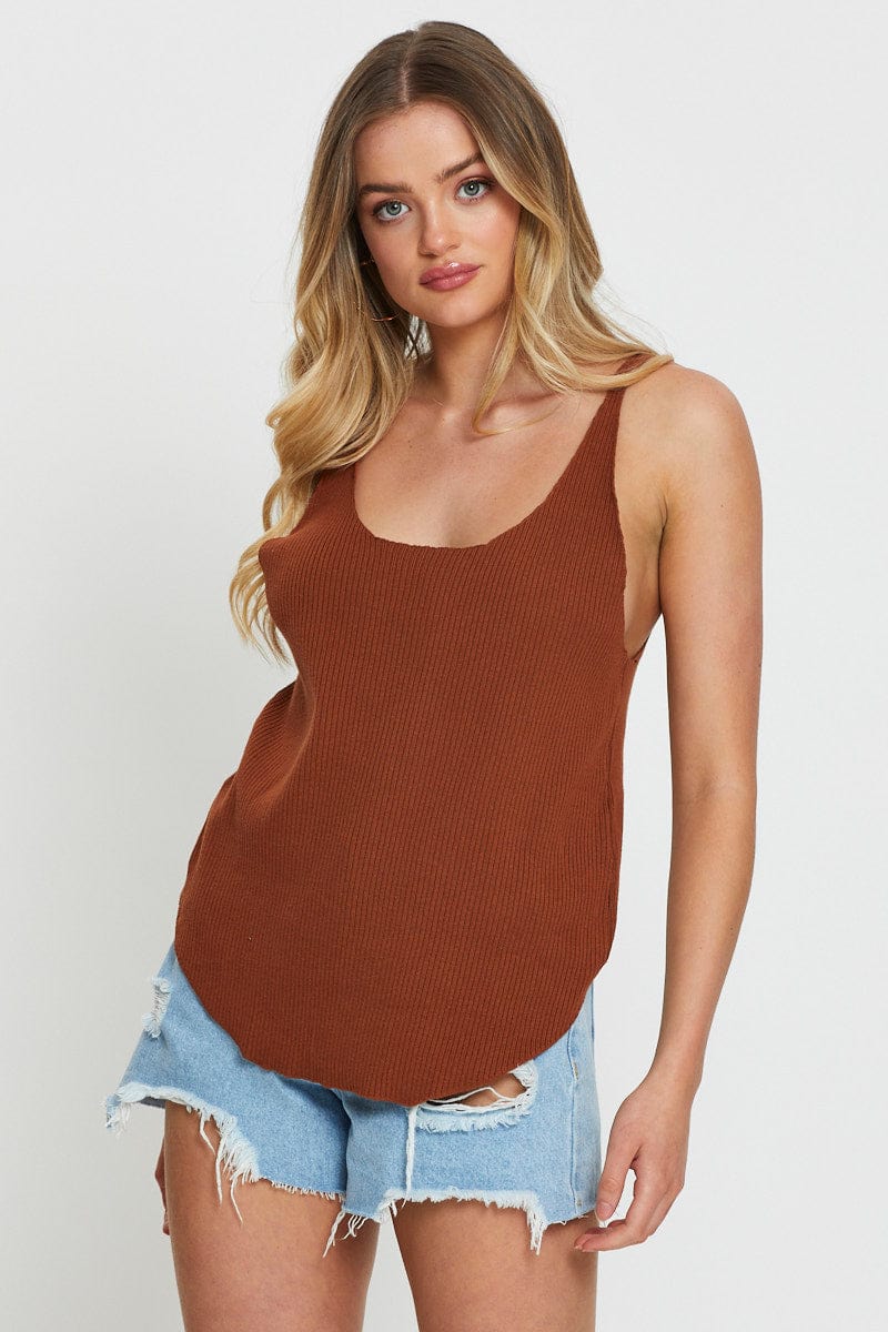 Brown Knit Top V-Neck