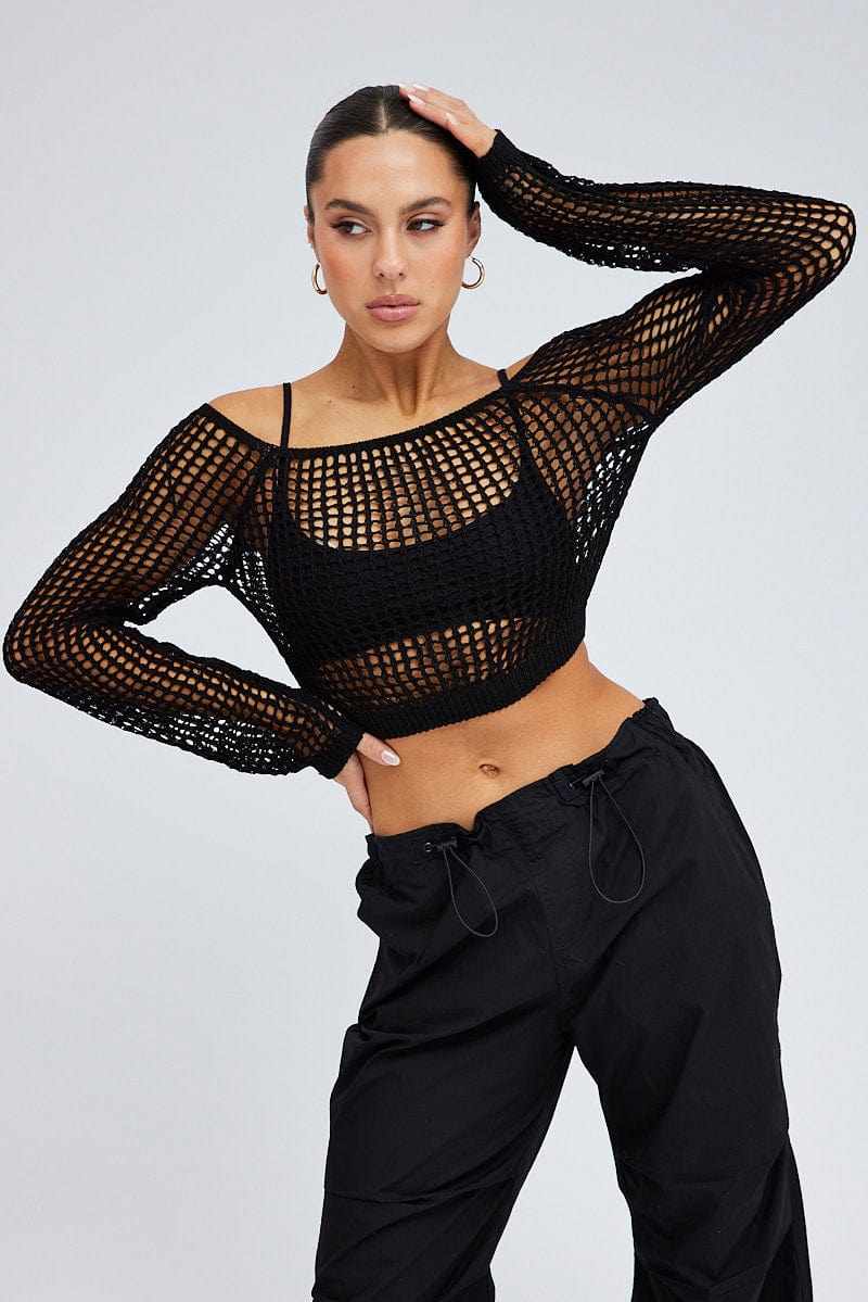 Black Crochet Knit Top Long Sleeve Square Neck