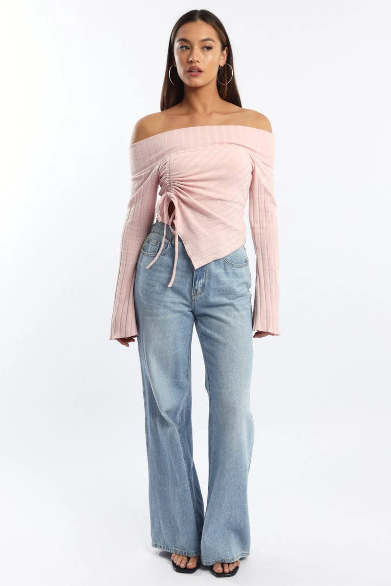 Pink Off Shoulder Top Long Sleeve Ruched