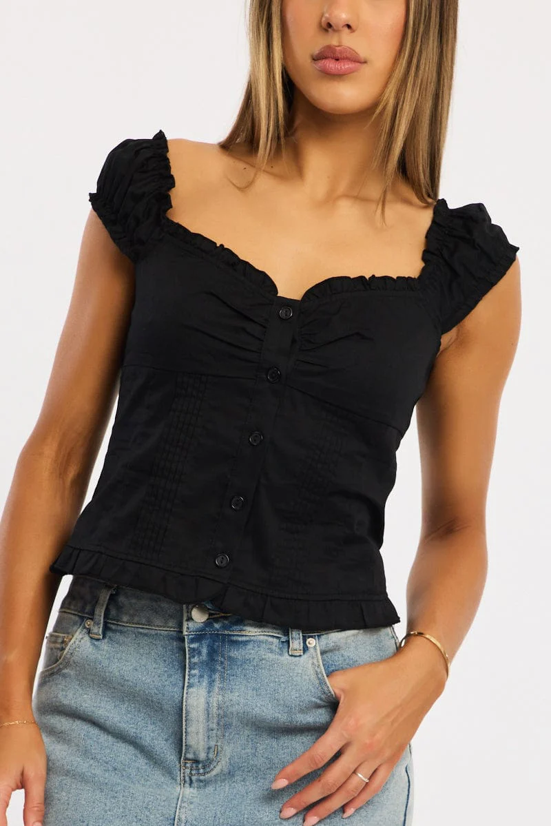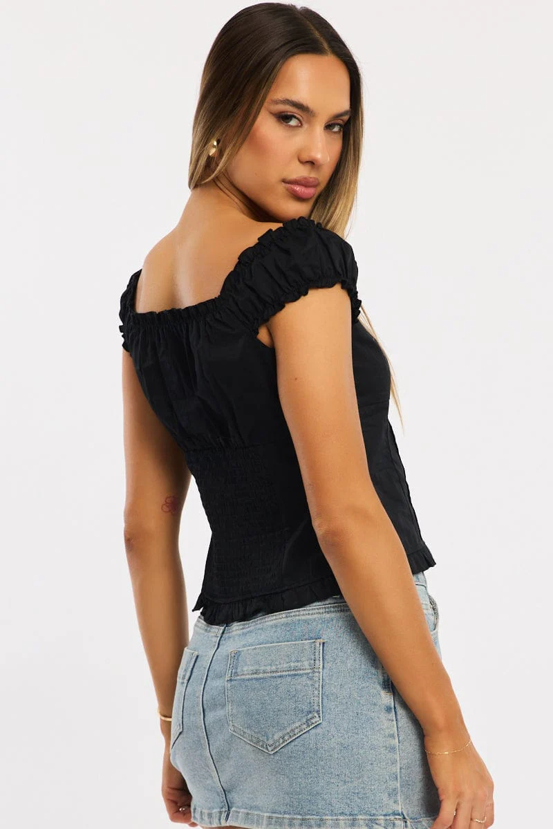 Black Top Short Sleeve Gathered Bust Pleated Detail