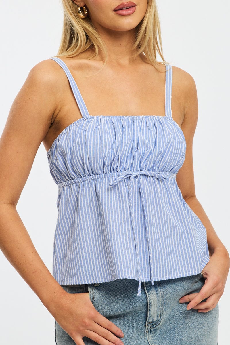 Blue Stripe Cami Top Sleeveless Front Tie Babydoll