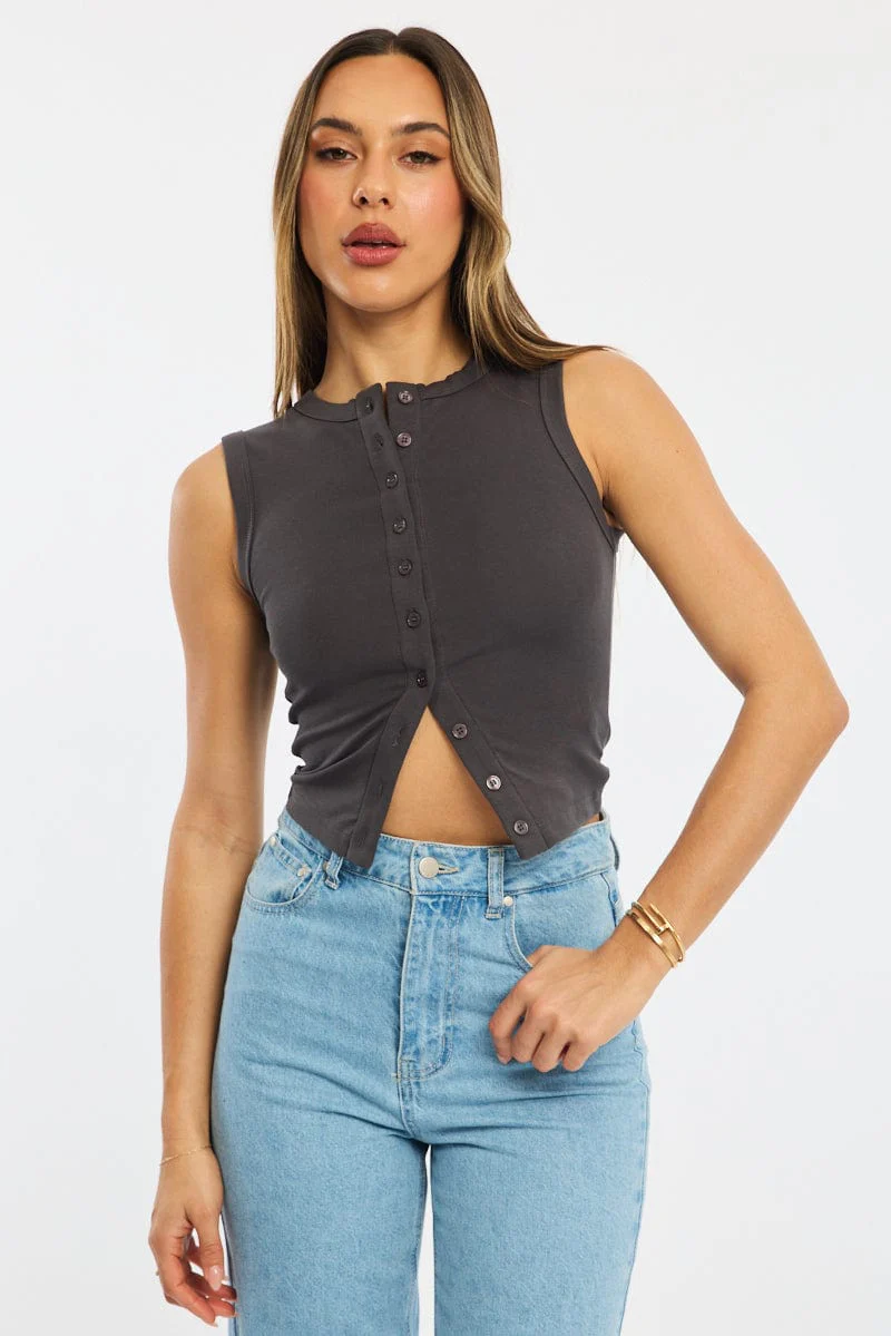 Grey Button Front Top Sleeveless
