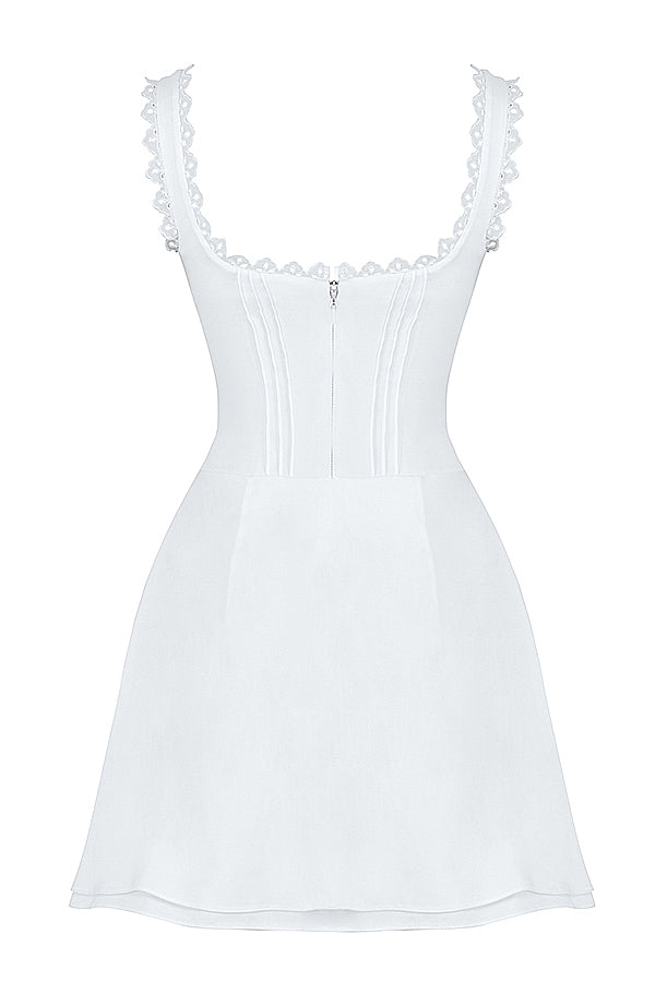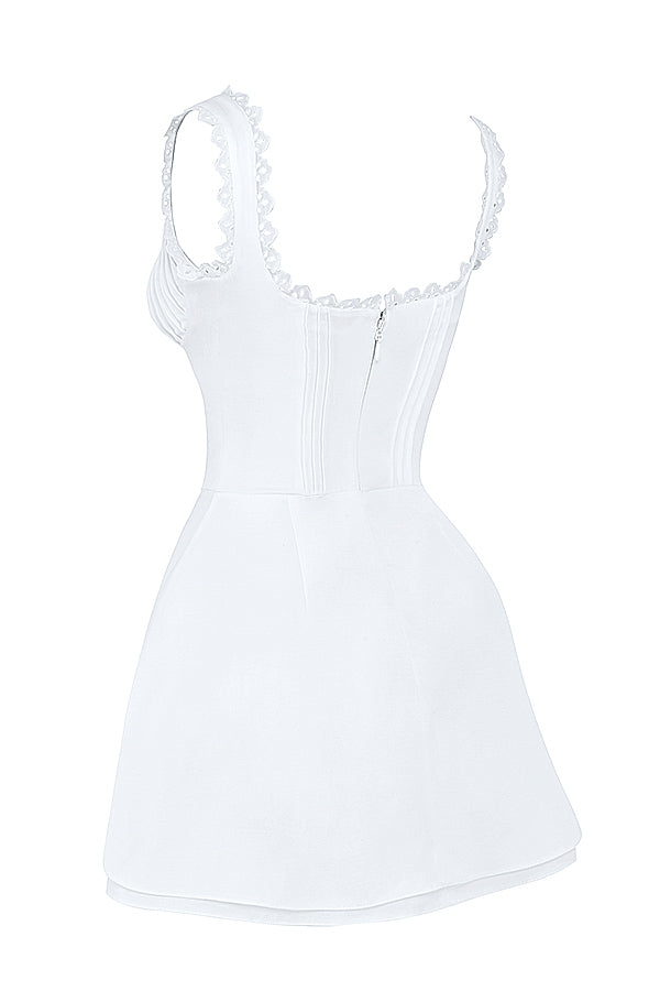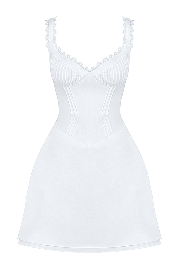 Tilly' is crisp, feminine and super Summery. Perfect for those Summer dates, we love the pintucked cups and the corset bodice that cinches the waist. Bronzed legs are highlighted with the flirty hemline. It is fully lined for comfort and has a zip to the back for easy on. Wear yours with our 'Lola' high heels in white on sunny days. The 'Regular Cup' option suits cup size A-C whilst the 'Bigger Cup' option suits cup size D-E.